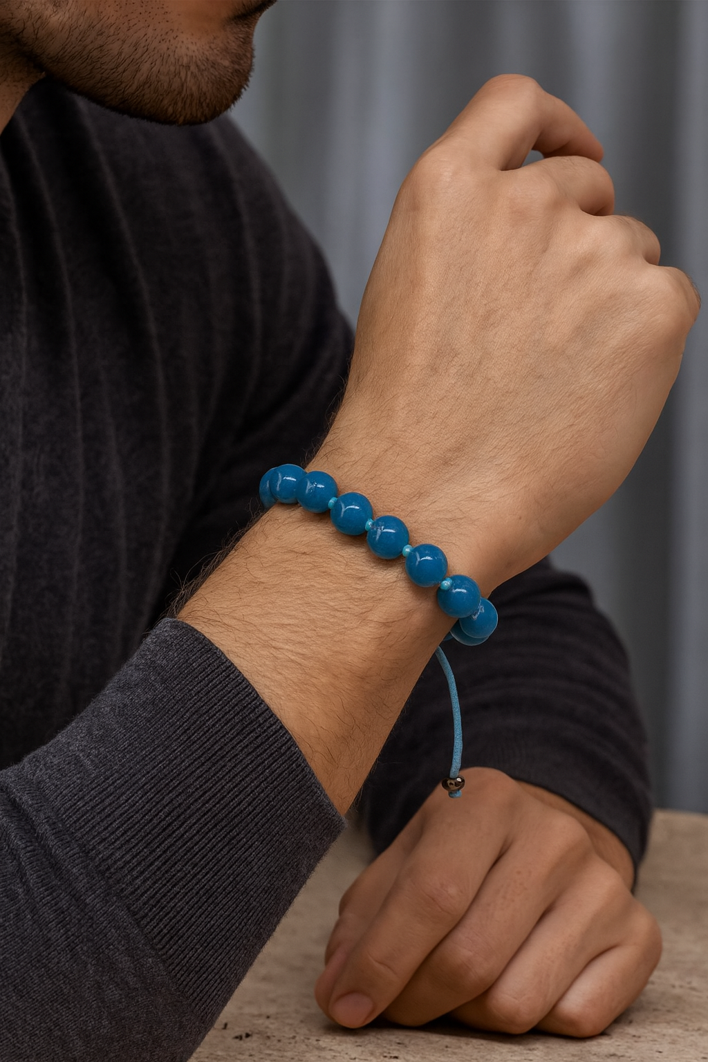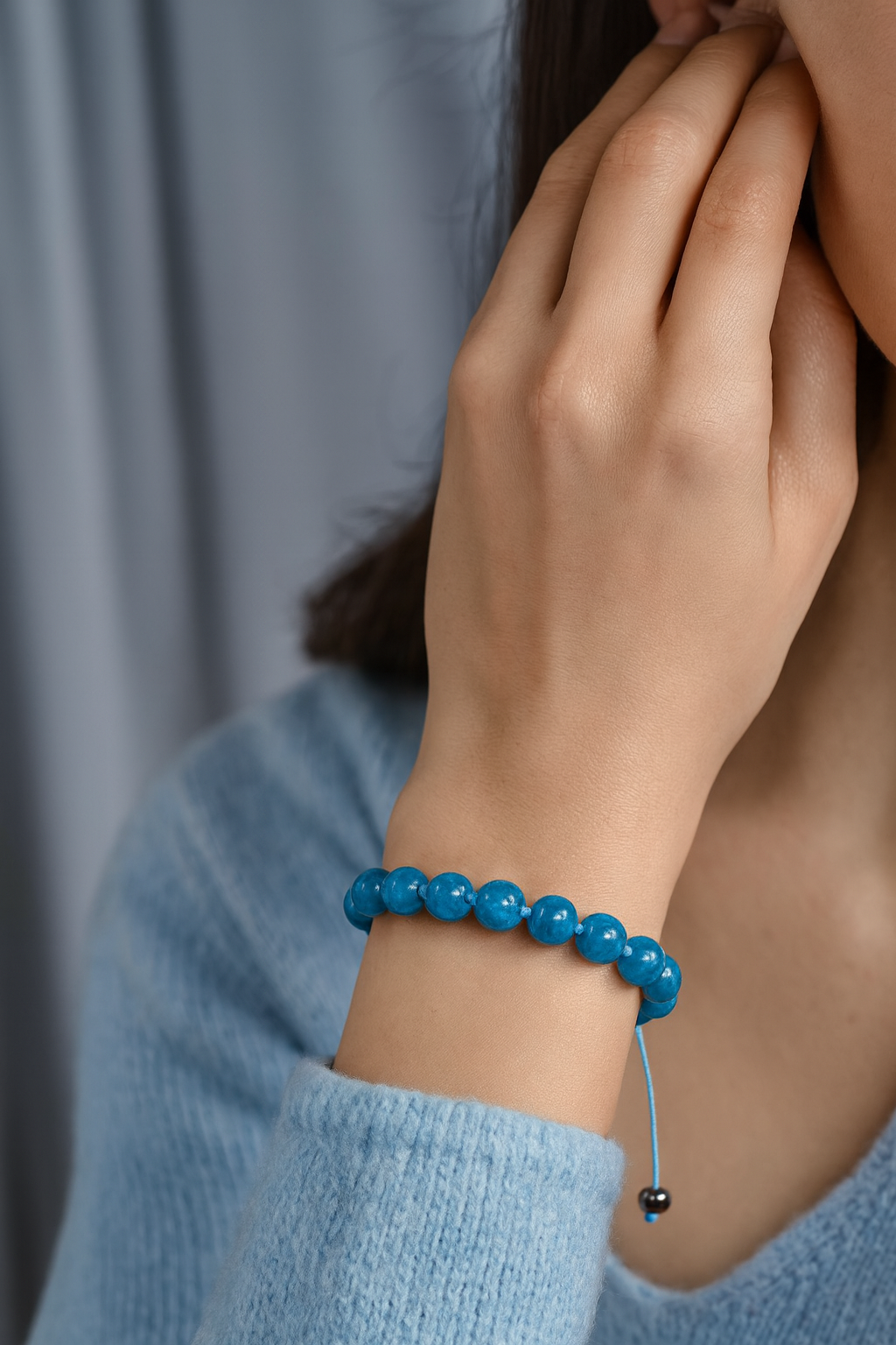 Tamamen doğal taşlardan oluşan bu özel bileklik, el örmesi makrome ip ile ayarlanabilir şekilde tasarlanmıştır. Apatit taşlarının her biri doğaldır ve renk, doku, saydamlık gibi yönleriyle birbirinden farklı ve benzersizdir.