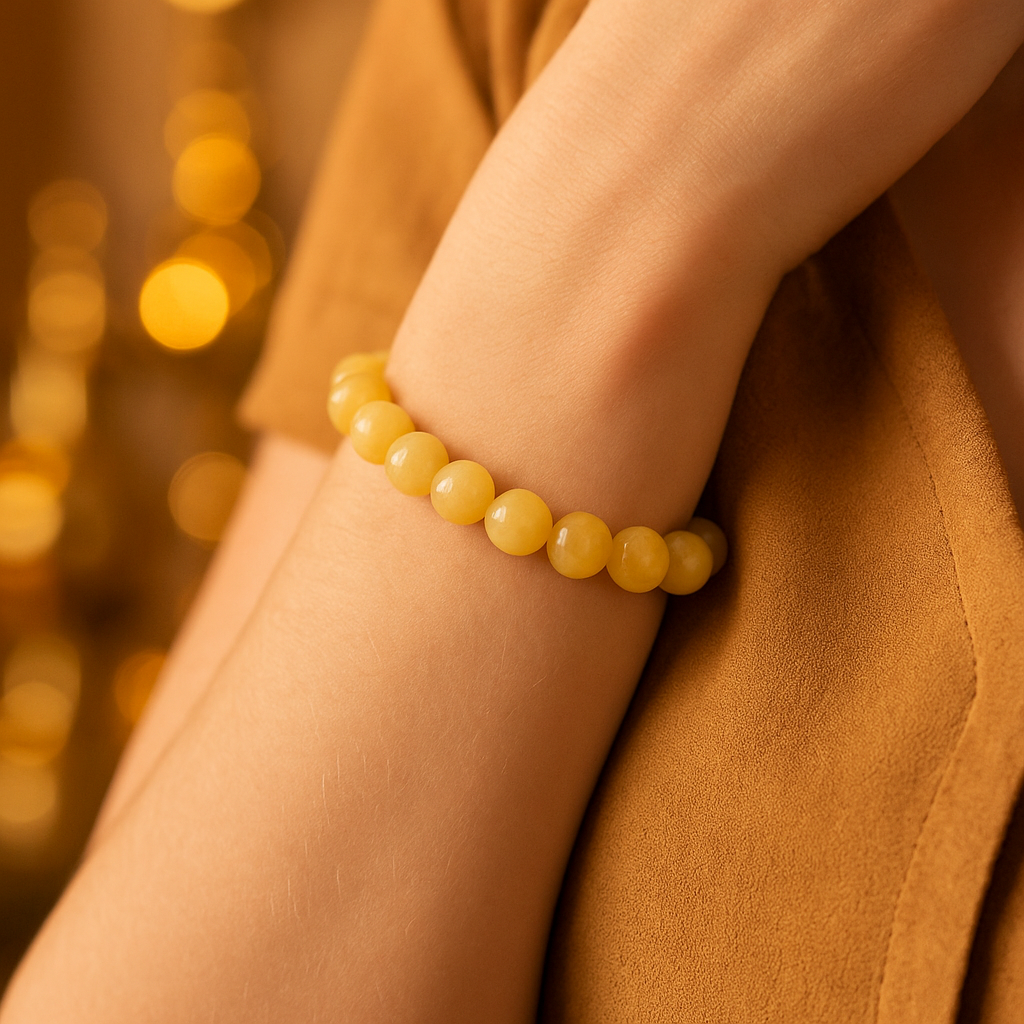 Toprak tonlarının sıcaklığını taşıyan aragonit taşı, bu zarif bileklikte 8 mm çapında küre kesimli formda sunulmuştur. Taşların doğal desenleri, açık kahve, krem ve bal rengi geçişleriyle her bilekliğe özgün bir karakter kazandırır.