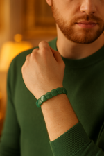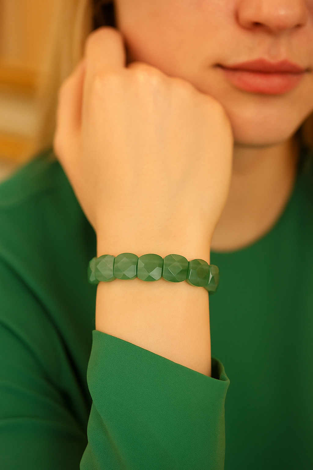 Doğanın yeşil tonlarını zarafetle taşıyan bu özel bileklik, 11 x 15 mm ölçülerinde dikdörtgen formda kesilmiş doğal aventurin taşlarından üretilmiştir. Taşların yarı saydam yapısı ve iç yüzeyindeki doğal ışıltılar, bileklikte dengeli ve sofistike bir görünüm oluşturur.