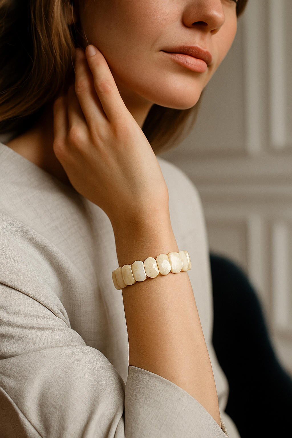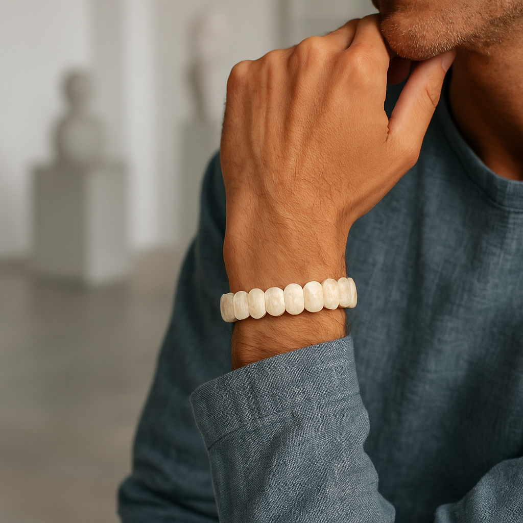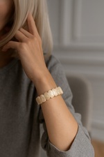 Ay taşı, ışığa göre değişen doğal parıltısıyla hem sade hem göz alıcı bir etki sunar. Geniş kesim formu sayesinde taşın içerisindeki yansımalar ve ipeksi dokular daha net görünür. Zarif, huzurlu ve estetik bir bileklik arayanlar için ideal bir seçenektir.
