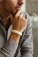 Süt beyazı, opak gri ve inci parlaklığını andıran yumuşak tonlarıyla tanınan ay taşı, bu özel bileklikte 9 x 14 mm ölçülerinde özel kesim ve geniş formda hazırlanmıştır. Taşların yüzeyinde ışıkla birlikte beliren zarif yansımalar, bilekte sakin, duru ve rafine bir duruş sergiler.