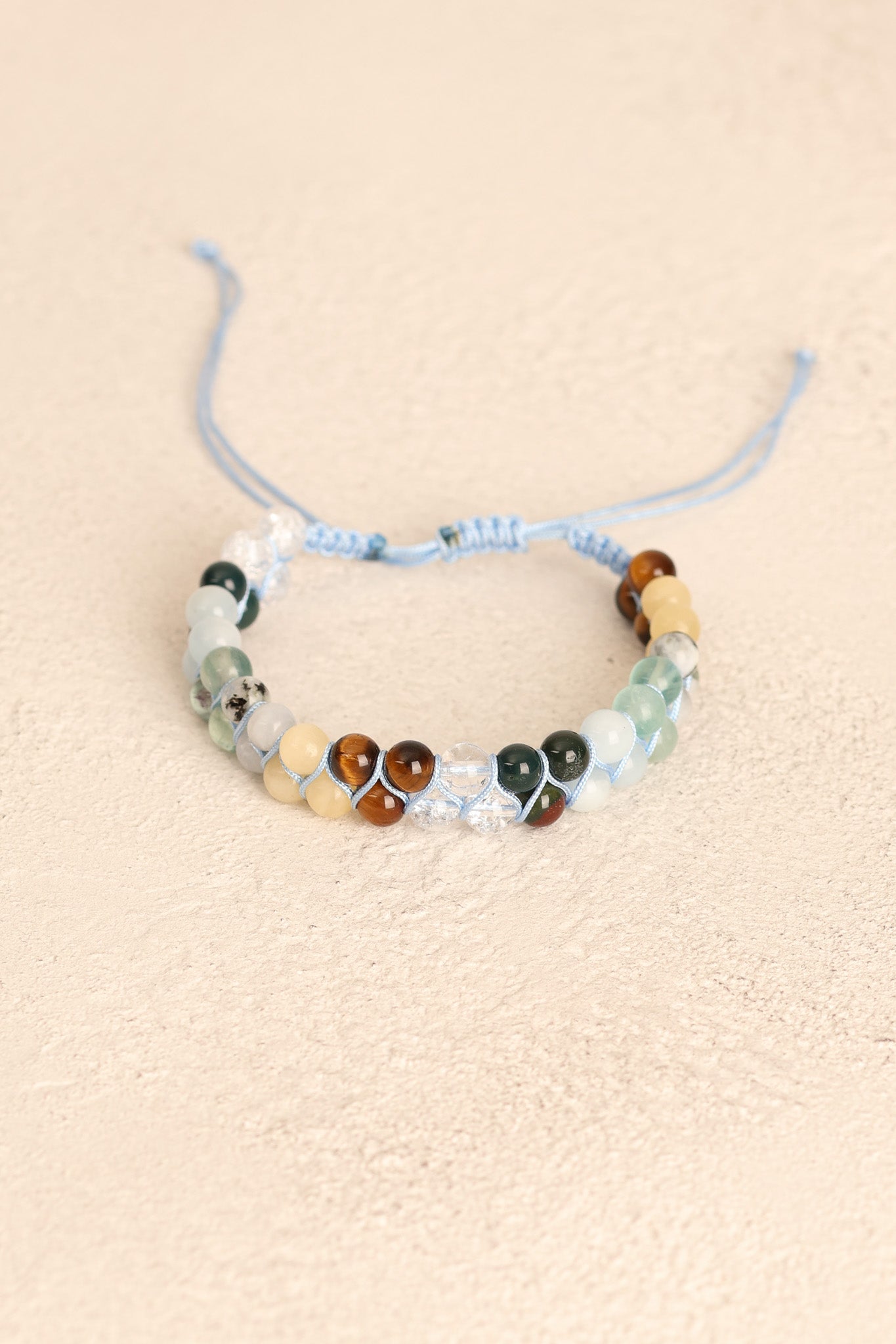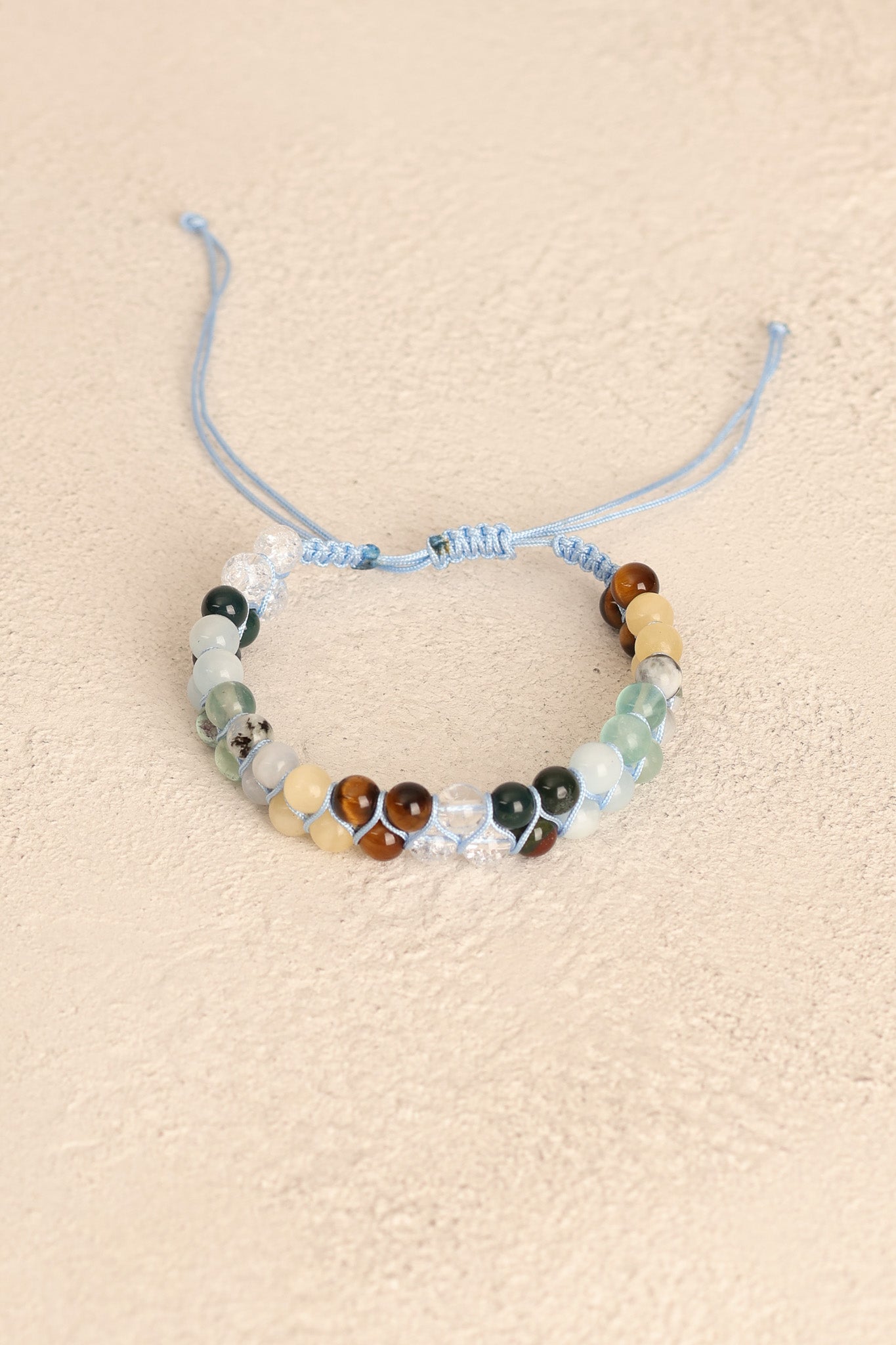 El işçiliğiyle örülmüş makrome bağlama tekniği, bilekliğe hem dayanıklılık hem de şık bir görünüm kazandırır.