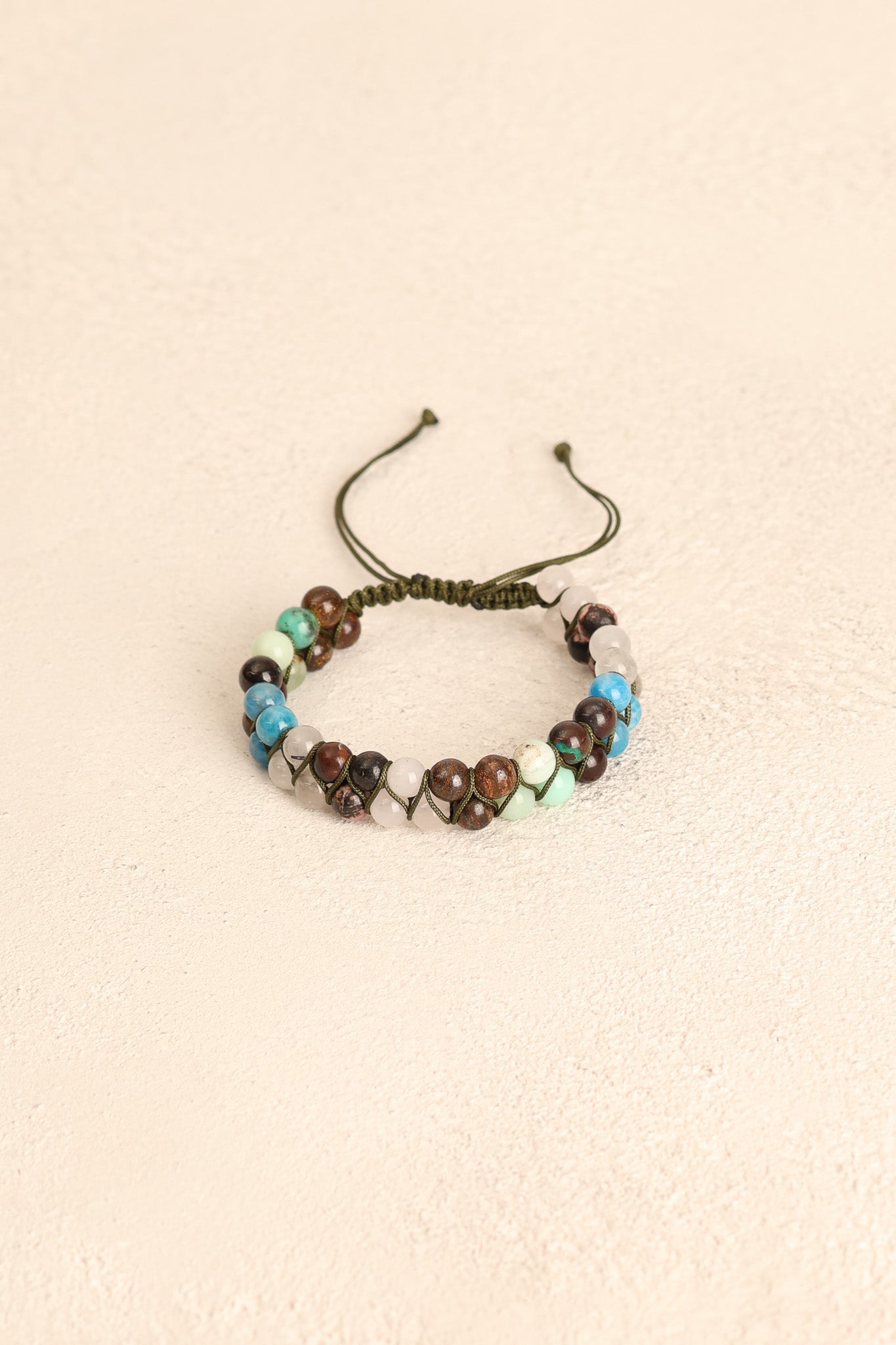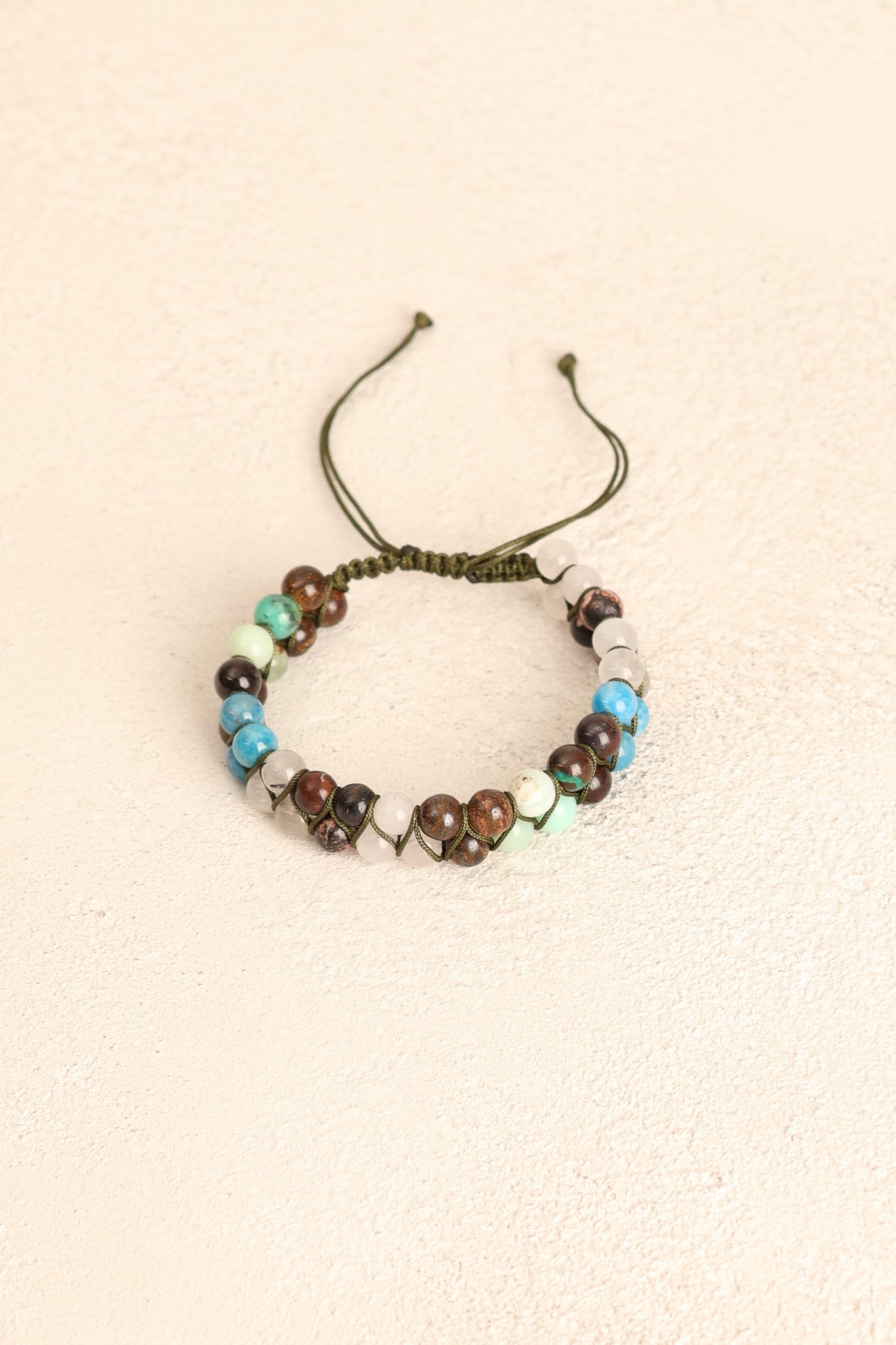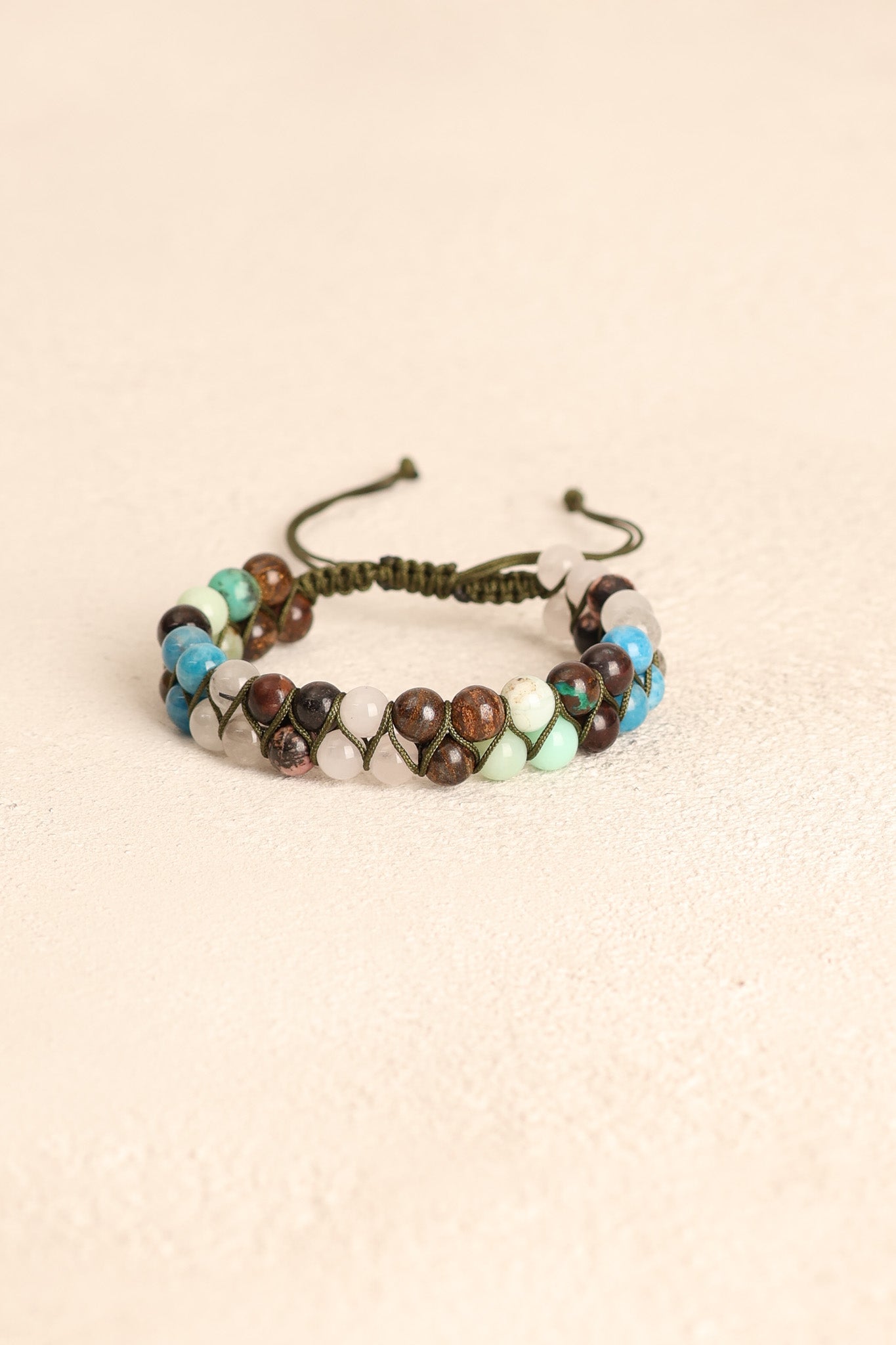 Pirtash ile Boğa burcuna özel seçilmiş doğal taşların zarif uyumunu, çift sıra makrome tasarım ve bilimsel güvenceyle bileğinizde taşıyın.