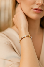 Gri, kahverengi, krem ve açık pembe tonlarının zarif katmanlar hâlinde sıralandığı Botswana akiği, bu özel bileklikte 6 mm yuvarlak kesim formunda dizilmiş ve doğal şıklığı yansıtan sade bir tasarımla sunulmuştur. Her taş, karakteristik bantlı yapısıyla bilekte sofistike ve dengeli bir duruş sergiler.