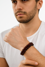 Kırmızı, yeşil ve gri tonlarının doğal çatlak desenlerle birleştiği dragon jasper taşı, bu özel bileklikte 8 mm yuvarlak kesim formunda dizilmiş ve çift sıra el yapımı makrome örgü ile tamamlanmıştır. Taşların yüzeyindeki ejderha derisini andıran desenler, bilekte güçlü ve özgün bir duruş sunar.