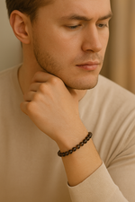 Yarı saydam kahverengi ve gri tonlarıyla tanınan dumanlı kuvars taşı, bu özel bileklikte 6 mm yuvarlak kesim formunda dizilmiş ve sade ama güçlü bir duruşla sunulmuştur. Taşların doğal parlaklığı ve içsel derinliği, bilekte zarif ve dengeli bir görünüm oluşturur.