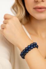 Dumortierit taşlarının benzersiz damar yapıları ve gece mavisine yakın tonları, her bilekliği doğadan gelen tekil bir parça hâline getirir. Çift sıra dizilim, taşların güçlü görünümünü hacimli ve dengeli biçimde vurgular. Sade ama etkileyici aksesuarlar arayanlar için ideal bir seçenektir.