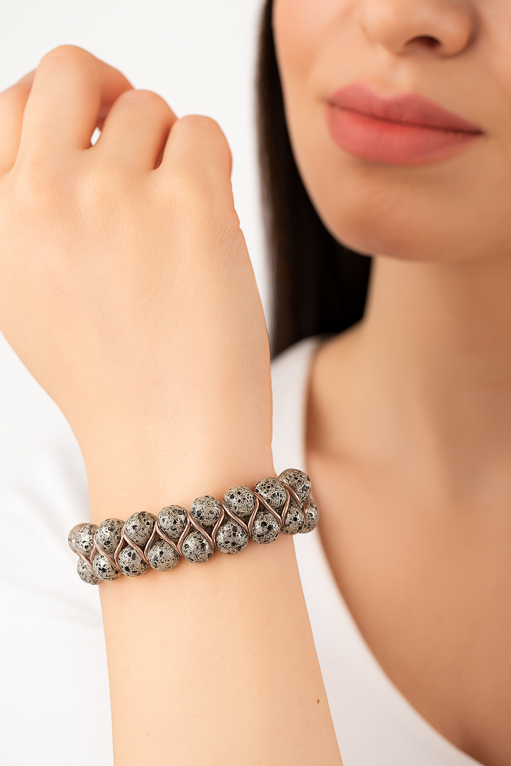 Lav taşının doğal gözenekli yapısı, her bilekliği eşsiz kılar. Çift sıra dizilimi sayesinde taşların dokusu daha çok ön plana çıkar. Gündelik kullanımda hem doğal hem de karizmatik bir stil arayanlar için ideal bir seçimdir.
