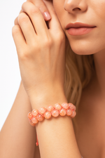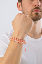 Sıcak şeftali, altın ve tarçın tonlarında ışıltılar yansıtan güneş taşı, bu özel bileklikte 8 mm yuvarlak kesim formunda dizilmiş ve çift sıra el yapımı makrome örgü ile tamamlanmıştır. Doğal taşların iç yansımaları sayesinde bilekte canlı, enerjik ve dengeli bir duruş sergiler.