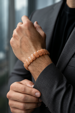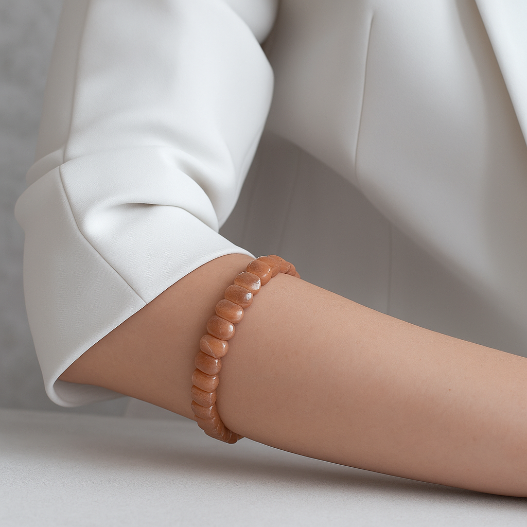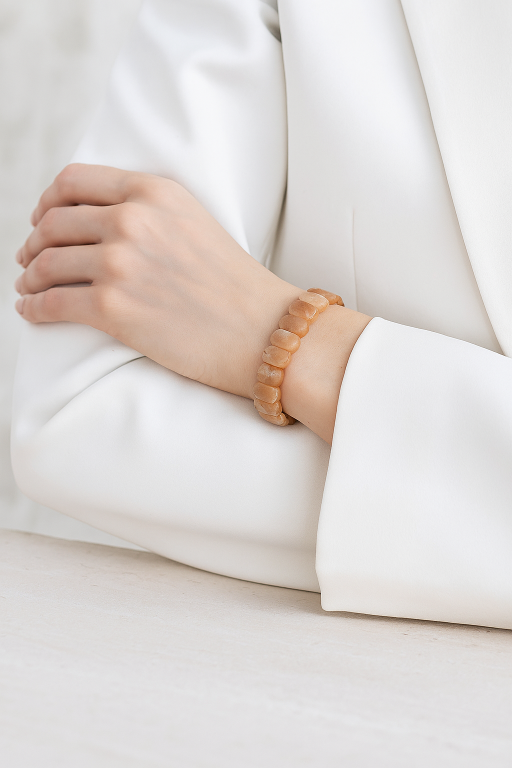 Şeftali, kehribar ve altın tonlarının içinde doğal ışıltılı mikalar barındıran güneş taşı, bu özel bileklikte 9 x 14 mm ölçülerinde özel kesim ve geniş formda tasarlanmıştır. Taşların yüzeyinde ışıkla birlikte beliren ince parıltılar, bilekte canlı, sıcak ve etkileyici bir duruş sergiler.