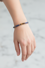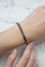 Kaplan gözünün altın-kahverengi yansımaları, sodalitin mavi-beyaz desenleri ve hematitin metalik gri parlaklığı bu bileklikte güçlü bir uyum oluşturuyor. Misinalı formu sayesinde bileğe kolayca oturur, esnek yapısıyla günlük kullanım için konfor sağlar. Hem sade hem de şık görünümüyle farklı kombinlere uyum sağlar.