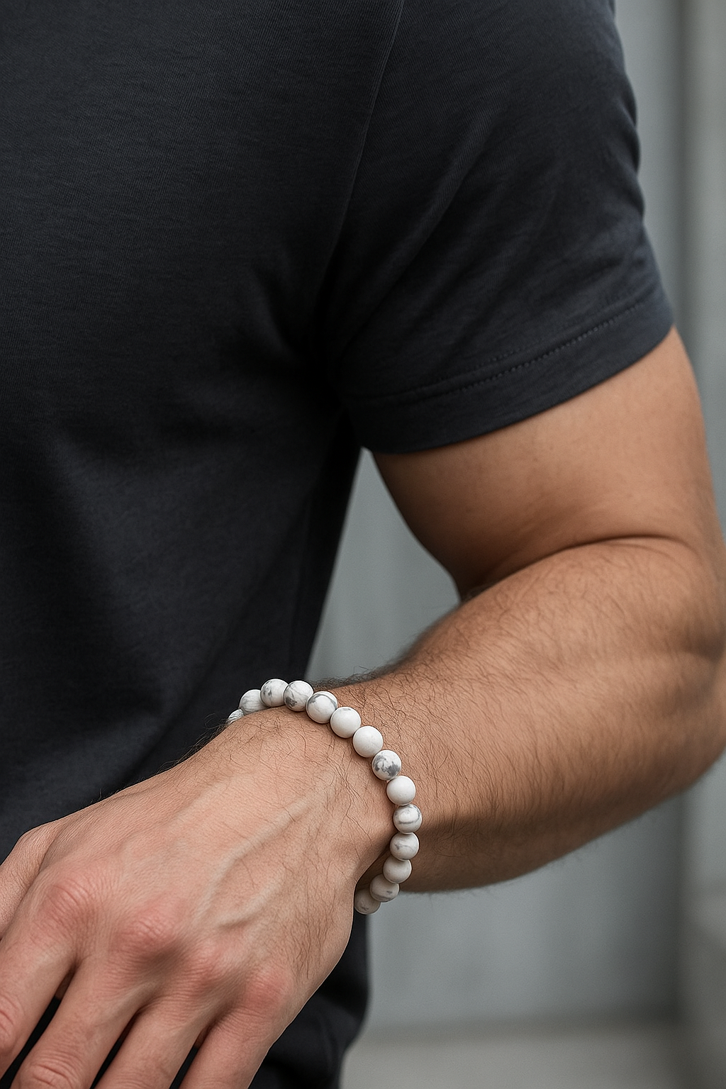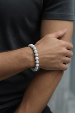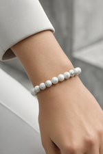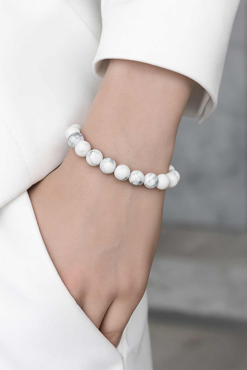 Beyaz zemin üzerinde gri damarlarla bezeli doğal görünümüyle tanınan havlit taşı, bu özel bileklikte 8 mm küre kesim formunda dizilmiştir. Mermerimsi dokusu ve sade yapısı sayesinde bilekte ferah, modern ve dengeli bir duruş sergiler.