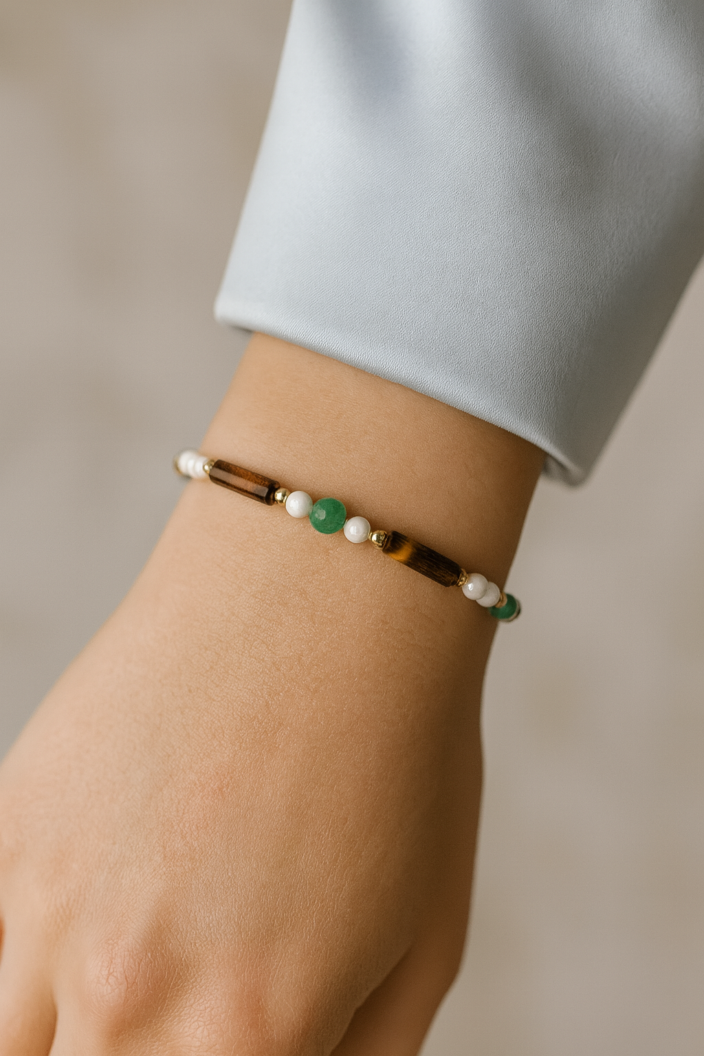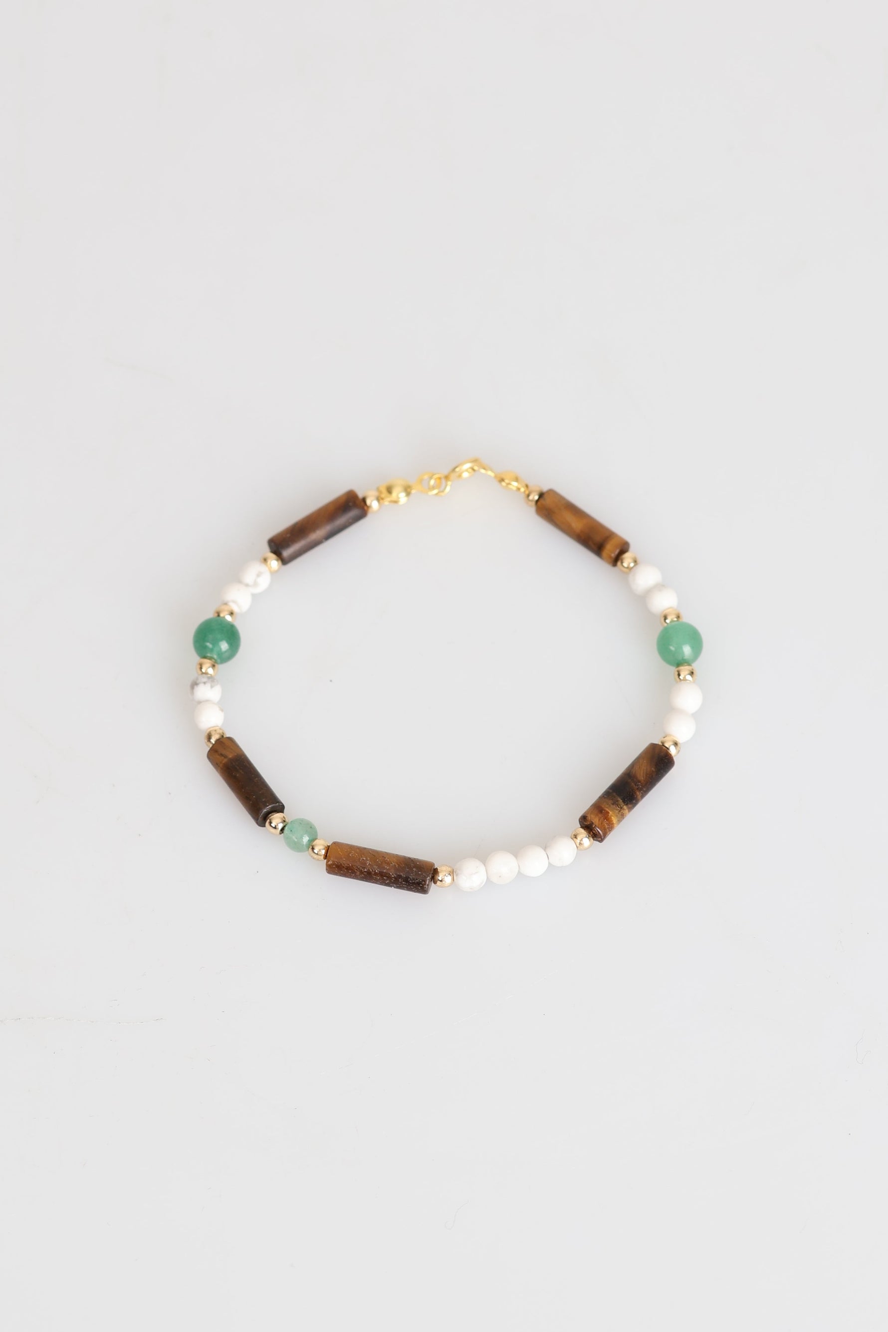 Doğal taşların uyumlu renkleri ve ışıltısıyla tasarlanan bu özel bileklikte %100 doğal havlit, %100 doğal yeşil aventurin ve %100 doğal kaplan gözü taşları bir araya geliyor.