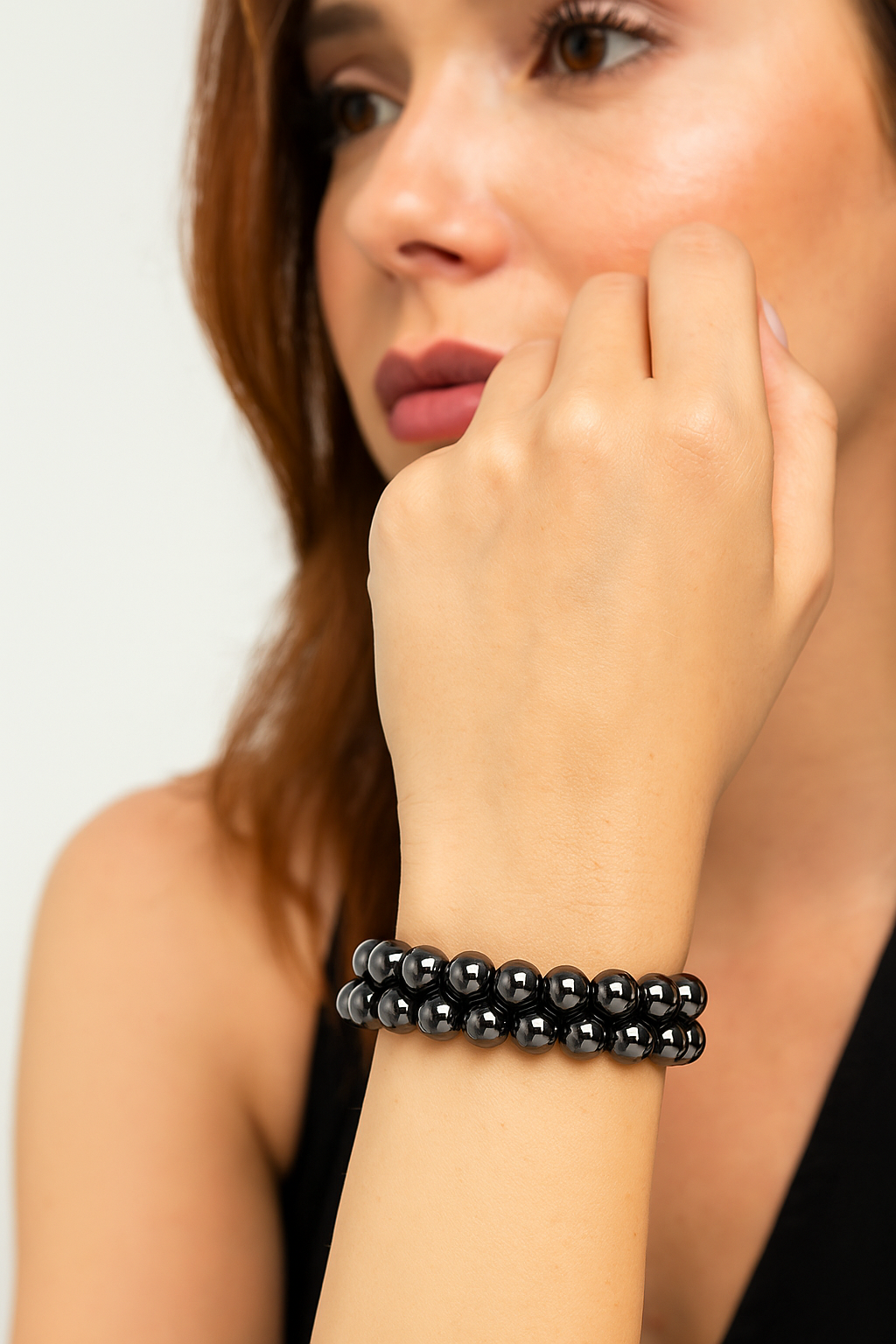 Hematit taşları, kendine has metalik parlaklıkları sayesinde her bilekliği sofistike ve dikkat çekici bir forma dönüştürür. Çift sıra dizilim, bu ışıltıyı daha hacimli ve güçlü biçimde öne çıkarır. Maskülen şıklığı ve sade zarafeti bir arada sunar.