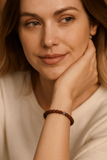 Tarçın kahvesi, kehribar ve bal tonlarıyla öne çıkan hessonit lal (granat) taşı, bu özel bileklikte 6 mm yuvarlak kesim formunda dizilmiş ve sade, doğal bir şıklıkla tamamlanmıştır. Her taşın ışıltısı ve ton geçişleri bilekte sıcak, dengeli ve asil bir duruş sunar.