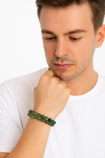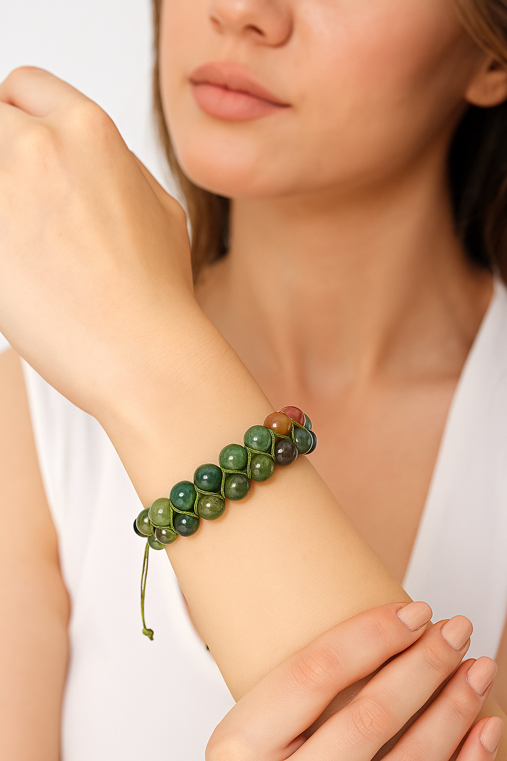 Toprak tonlarından yeşile, griye ve bazen maviye uzanan doğal renk geçişleriyle öne çıkan Hint akiği, bu özel bileklikte 8 mm yuvarlak kesim formunda dizilmiş ve çift sıra el yapımı makrome örgü ile tamamlanmıştır. Taşların doğallığını yansıtan bu özel tasarım, bilekte sade ama güçlü bir karakter sunar.