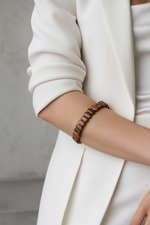 Sıcak kahverengi, bej ve krem tonlarının doğal dalga ve damar desenleriyle şekillendiği kahve jasper taşı, bu özel bileklikte 9 x 14 mm ölçülerinde özel kesimli ve geniş formlu taşlarla hazırlanmıştır. Her taşın yüzeyinde benzersiz doğa izleri bulunur ve bilekte tok, köklü ve zarif bir duruş sergiler.