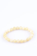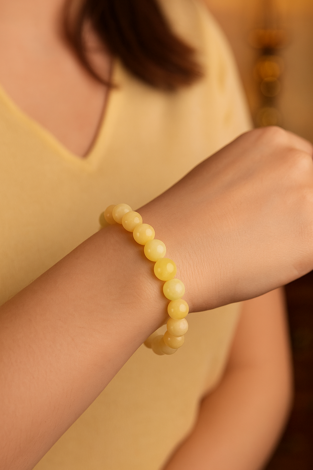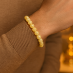 Canlı sarı, bal ve krem tonlarıyla dikkat çeken doğal kalsit taşı, bu özel bileklikte 8 mm çapında küre kesim formda sunulmuştur. Yarı saydam yapısı ve parlak yüzeyiyle sade ama güçlü bir duruş sergiler.