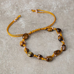 Işığa göre değişen altın kahverengi yansımaları ve ipeksi çizgileriyle tanınan kaplan gözü taşı, bu özel bileklikte natürel (ham formuna yakın) kesimiyle sunulmuştur. Her taş, doğadaki özgün formunu koruyarak el yapımı ayarlanabilir makrome örgüyle birleştirilmiştir.