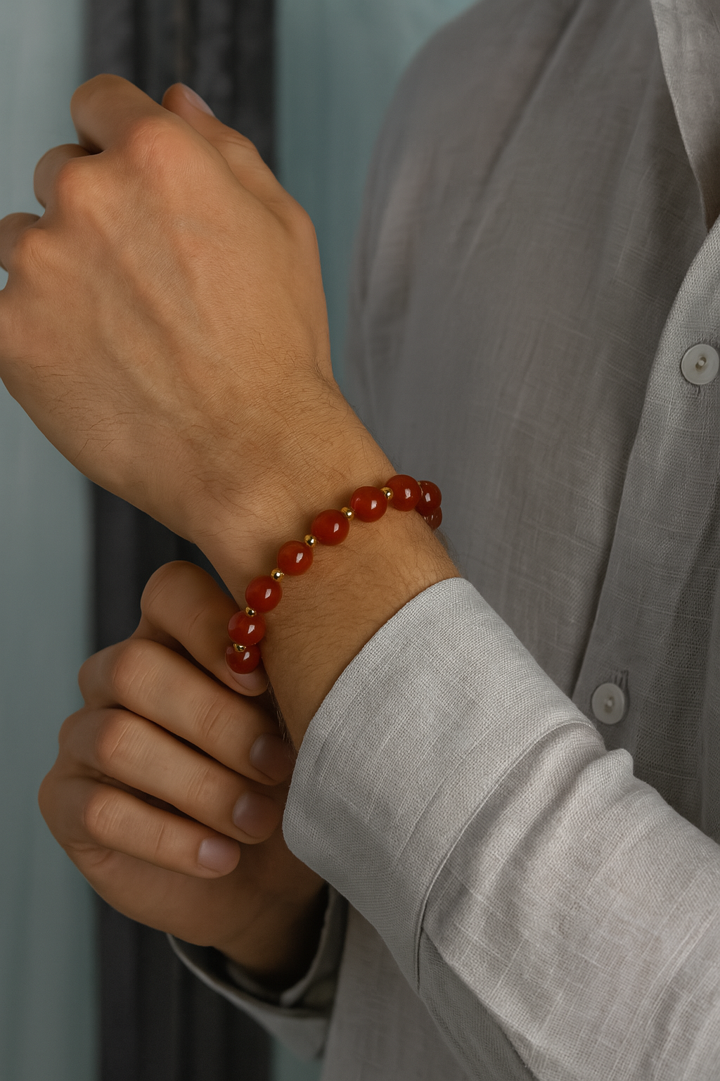 Her taş %100 doğaldır ve bileklikler, her sipariş için tek tek ve kişiye özel olarak üretilir. Kırmızı akikin derin rengi ile hematitin net çizgisi, modern ve kararlı bir stil sunar.