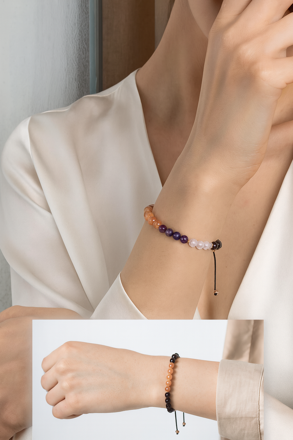 El yapımı siyah makrome örgüsüyle bileğe kolayca uyum sağlar ve ayarlanabilir yapısı sayesinde her bilek ölçüsüne uygun konforlu bir kullanım sunar. Taşlar arasındaki metal detaylar, bilekliğe zarif bir şıklık katar.