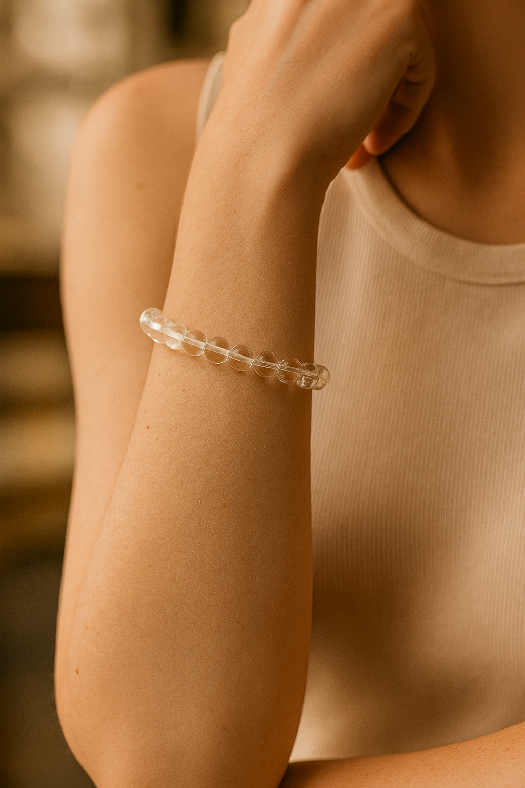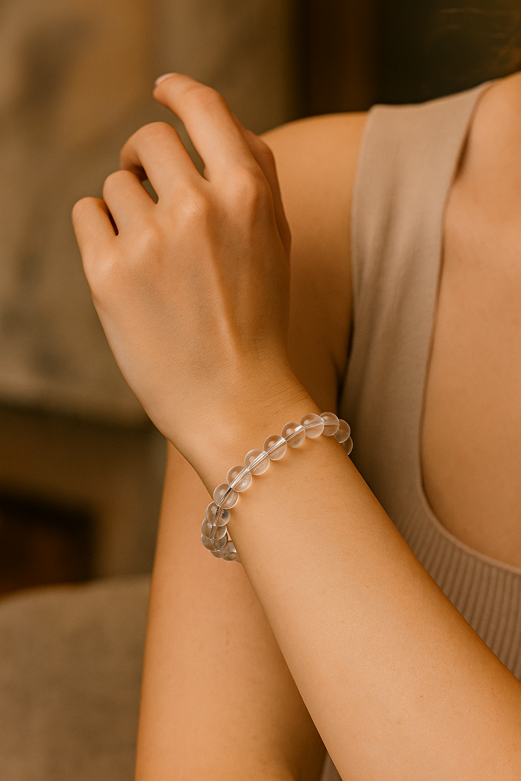 Cam berraklığındaki yapısı ve içsel ışıltısıyla tanınan kristal kuvars taşı (diğer adıyla dağ kristali), bu özel bileklikte 8 mm yuvarlak kesim formunda dizilmiş ve sade, saf bir tasarımla sunulmuştur. Her taşın ışığı kusursuz şekilde yansıtması sayesinde bilekte duru, net ve arınmış bir görünüm oluşur.