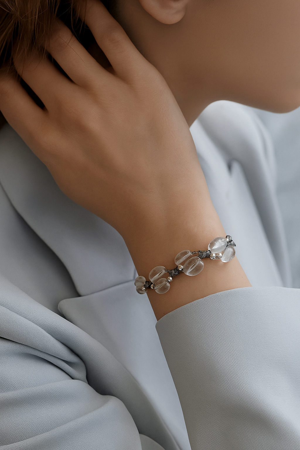 Tamamen şeffaf yapısı, cam berraklığı ve içindeki doğal izlerle dikkat çeken kristal kuvars taşı, bu özel bileklikte özenle seçilmiş doğal taşlar ve el yapımı ayarlanabilir makrome örgü tekniği ile hazırlanmıştır. Taşların ışıltısı ve sadeliği, bilekte saf, zarif ve güçlü bir duruş sunar.