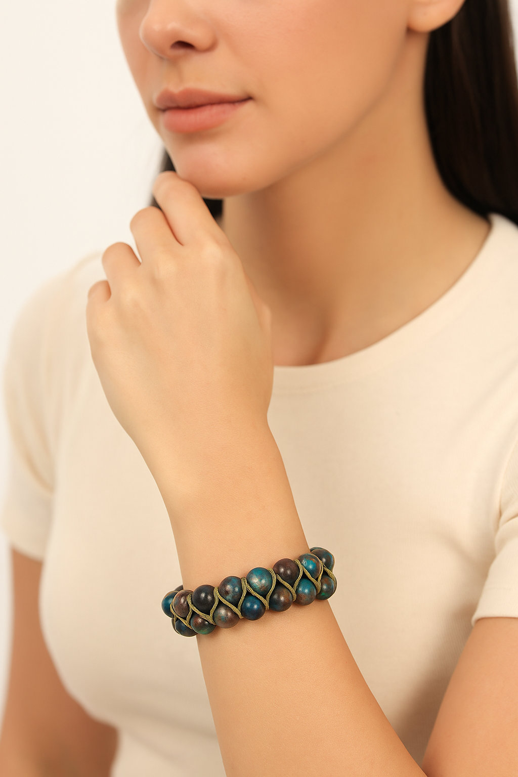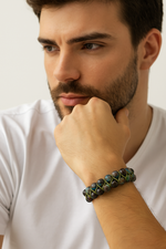 Turkuazdan koyu yeşile uzanan doğal tonları ve yüzeyindeki karakteristik damar yapısıyla tanınan krizokol taşı, bu özel bileklikte 8 mm yuvarlak kesim formunda dizilmiş ve çift sıra el yapımı makrome örgü ile tamamlanmıştır. Canlı renk geçişleri ve doğal dokusu, bilekte hem güçlü hem de dengeli bir duruş sunar.