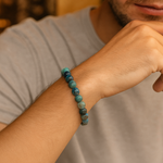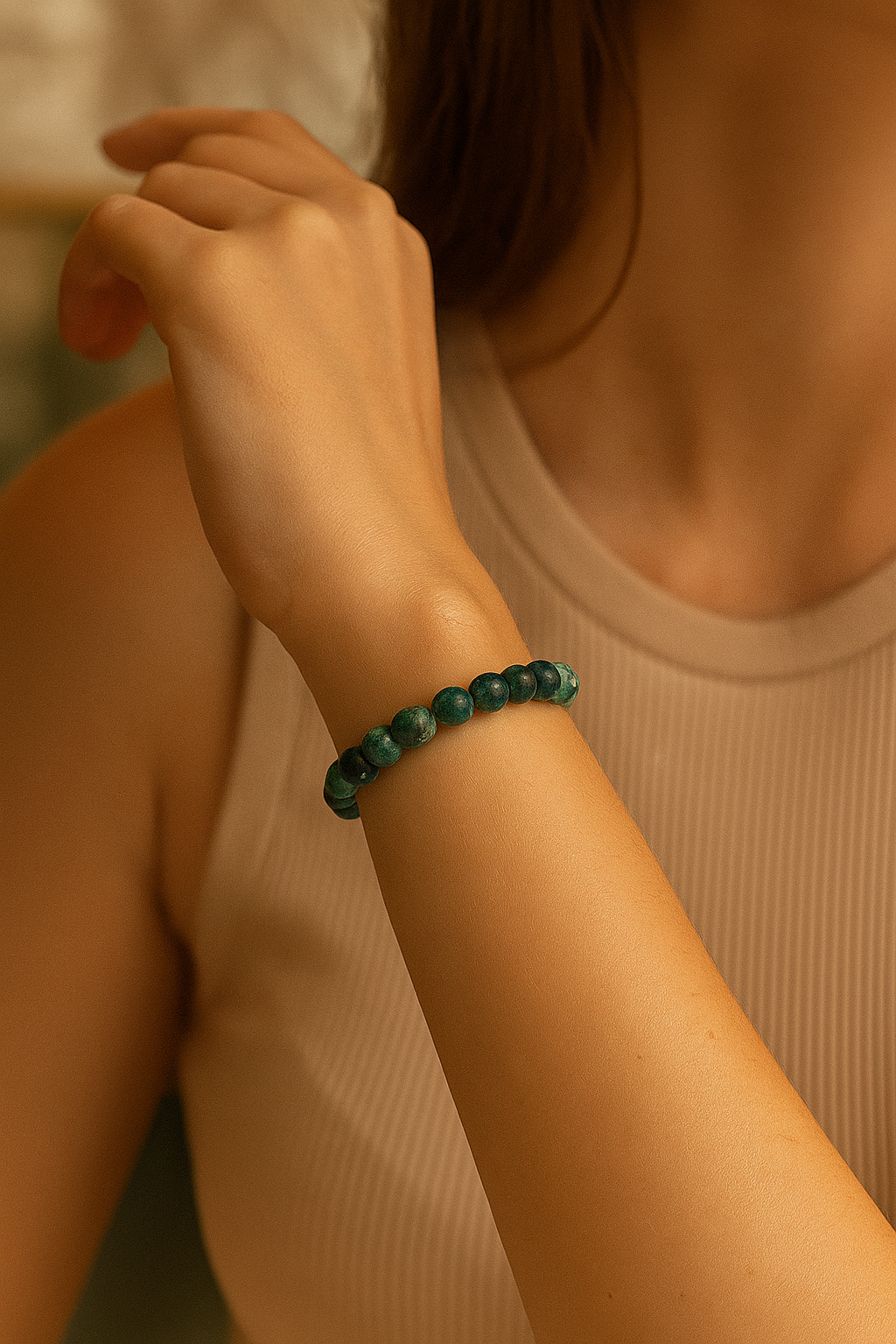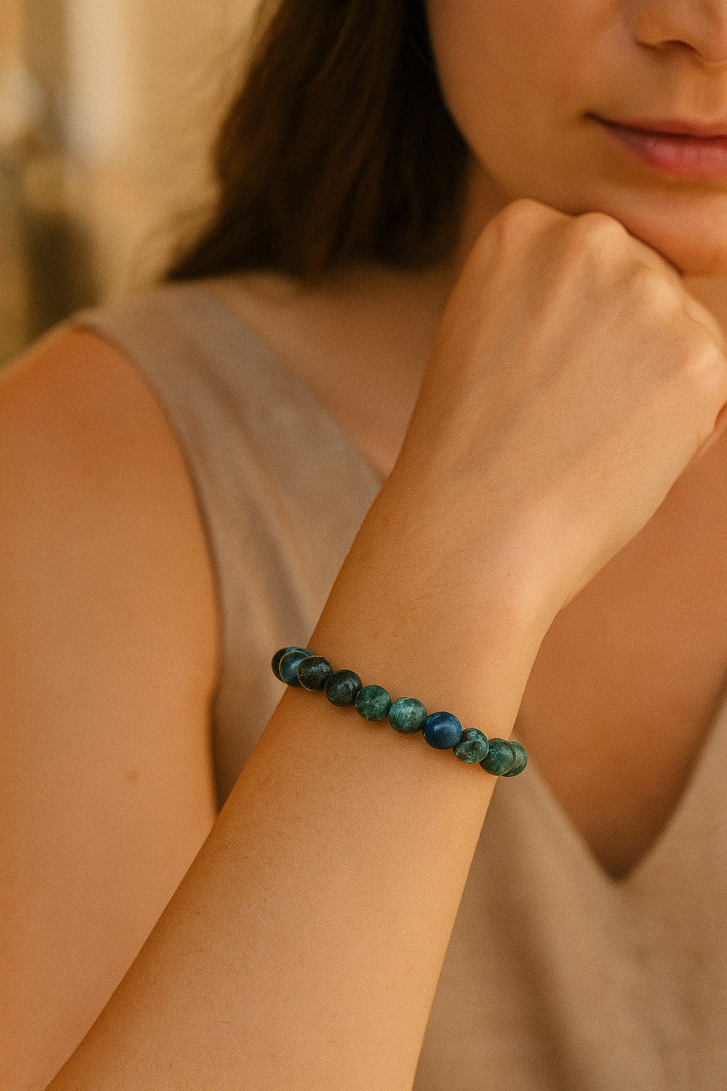 Turkuaz, zümrüt yeşili, toprak kahverengisi ve petrol mavisi tonlarının eşsiz uyumunu taşıyan krizokol taşı, bu özel bileklikte 8 mm yuvarlak kesim formunda dizilmiş ve doğadan ilham alan güçlü bir tasarımla sunulmuştur. Her taşın benzersiz desenleri ve renk geçişleri, bilekte etkileyici ve özgün bir duruş sergiler.