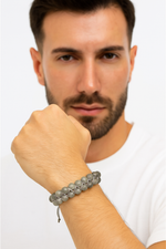 Gri zemin üzerinde mavi, yeşil ve altın yansımalarıyla göz alıcı bir etki yaratan labradorit taşı, bu özel bileklikte 8 mm yuvarlak kesim formunda dizilmiş ve çift sıra el yapımı makrome örgü ile tamamlanmıştır. Işığa göre değişen ışıltılı yapısı, bilekte sofistike ve mistik bir duruş sergiler.