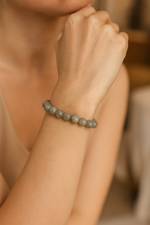 Gri zemin üzerinde ışığa göre mavi, yeşil ve altın tonlarında parlayan etkileyici “labradoresans” yansımalarıyla tanınan labradorit taşı, bu özel bileklikte 8 mm yuvarlak kesim formunda dizilmiş ve sofistike bir tasarımla sunulmuştur. Taşların doğal ışık oyunları, bilekte gizemli ve karizmatik bir duruş sergiler.
