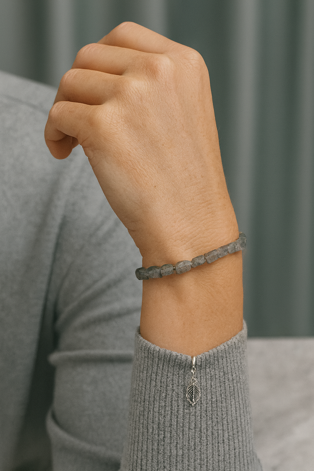 Işığa göre mavi, yeşil ve gri yansımalar oluşturan doğal labradorit taşı, 925 ayar saf gümüş detaylarla bir araya gelerek sofistike bir bileklik tasarımına dönüşüyor.
