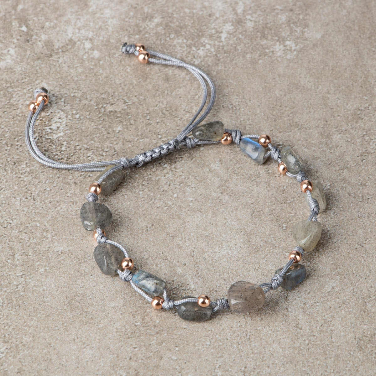 Doğal gri tabanı üzerinde mavi, yeşil ve altın tonlarında ışıltılar yansıtan labradorit taşı, bu özel bileklikte natürel (ham formuna yakın) kesimiyle sunulmuştur. Taşların her biri doğadan geldiği haliyle işlenmiş; el yapımı ayarlanabilir makrome ip ile zarif bir uyum içinde birleştirilmiştir.
