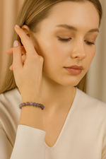 Lavanta, lila ve gri-mor tonlarının doğal ışıltılarla birleştiği lepidolit taşı, bu özel bileklikte 6 mm yuvarlak kesim formunda dizilmiş ve zarif bir tasarımla sunulmuştur. İçeriğindeki doğal lityum mineralleri sayesinde taşların yüzeyinde sedefli bir parlaklık gözlemlenir. Hafif yapısı ve sakin tonu, bilekte huzurlu ve şık bir görünüm sunar.