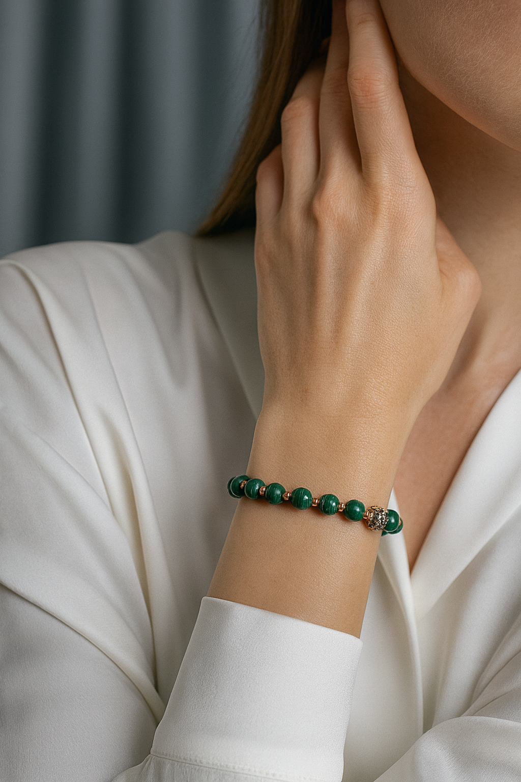 Pirtash ile malakit taşının doğal yeşil desenlerini, hematitin modern parlaklığıyla ve bilimsel güvenceyle bileğinizde taşıyın.