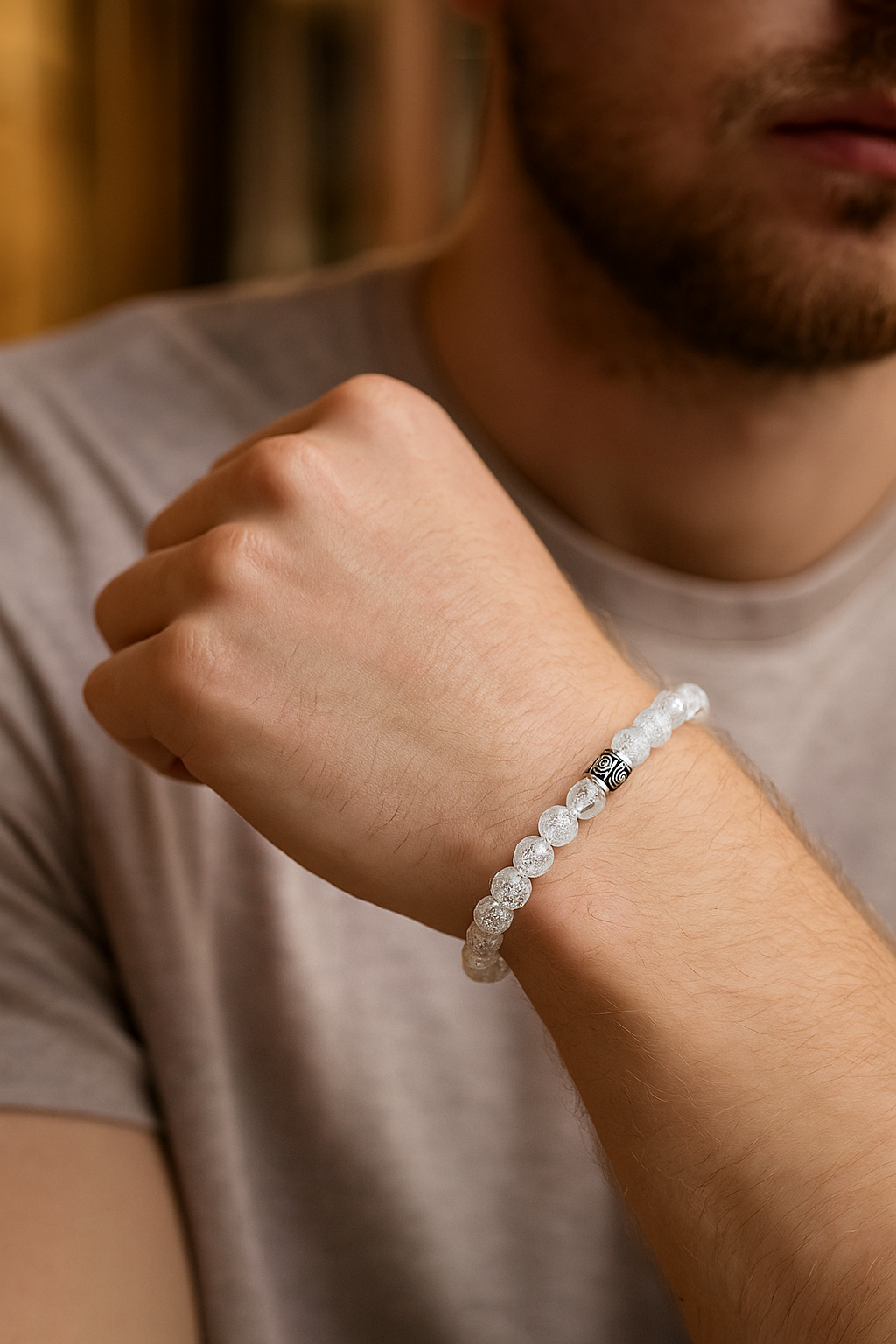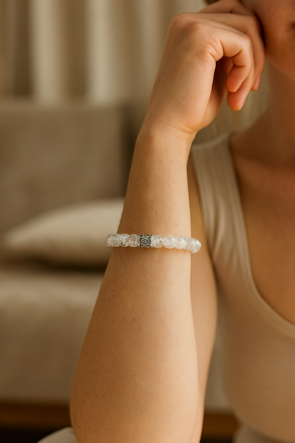Cam berraklığında ve ışık geçirgenliği yüksek yapısıyla tanınan necef taşı (dağ kristali olarak da bilinir), bu özel bileklikte 8 mm yuvarlak kesim formunda dizilmiş ve sade, duru bir tasarımla sunulmuştur. Saydam yapısı sayesinde ışığı yumuşak bir şekilde kıran taşlar, bilekte saf, zarif ve minimal bir duruş oluşturur.