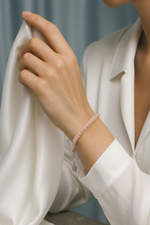 Yumuşak ve doğal pembe tonlarıyla dikkat çeken pembe kuvars taşı, 925 ayar saf gümüş detaylarla buluşarak sade ve zarif bir bilekliğe dönüşüyor.