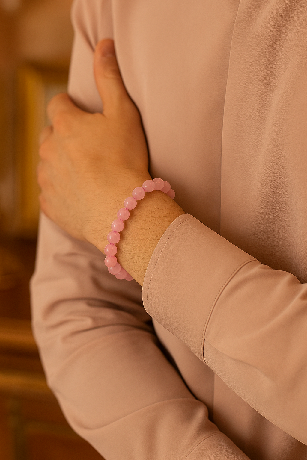Yumuşak pembe tonlarıyla zarif bir görünüm sunan bu bileklik, 8 mm çapında küre kesim doğal pembe kuvars taşlarından özenle hazırlanmıştır. Her taşın doğal parlaklığı ve dokusu, sade şıklığı sevenler için ideal bir uyum sağlar.