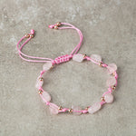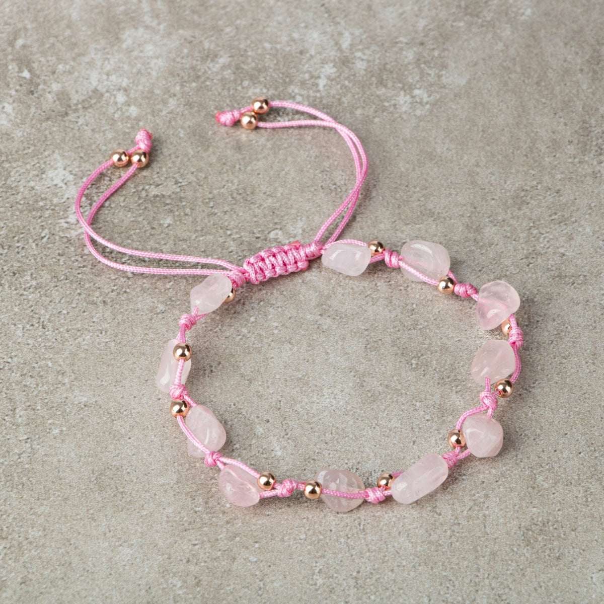 Yumuşak pembe tonları ve yarı saydam yapısıyla öne çıkan pembe kuvars (gül kuvars) taşı, bu özel bileklikte natürel kesimiyle, yani ham formuna yakın şekilde işlenerek sunulmuştur. Her taş, el işçiliğiyle örülmüş ayarlanabilir makrome ip ile zarif bir bütünlük içinde tamamlanmıştır.