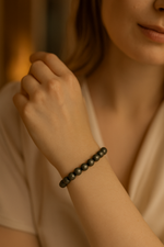 Altın-bronz metalik parlaklığıyla dikkat çeken pirit taşı, bu özel bileklikte 8 mm yuvarlak kesim formunda dizilmiş ve şeffaf misina ile sade, modern bir görünümde sunulmuştur. Taşların güçlü yansımaları ve tok duruşu, bilekte karizmatik ve sofistike bir etki bırakır.