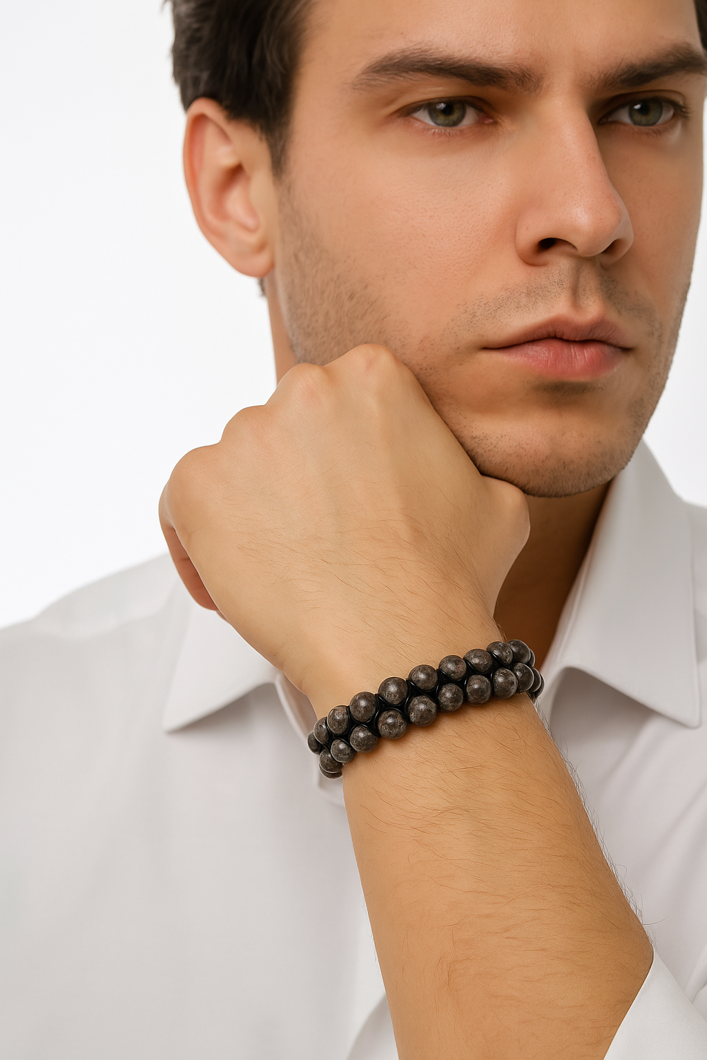 Riyolit taşlarının her biri, benzersiz renk geçişleri ve yüzey desenleriyle doğadan gelen özgünlük taşır. Çift sıra dizilim, bu detayları daha görünür kılarak bilekliğe hacimli ve etkileyici bir duruş kazandırır.