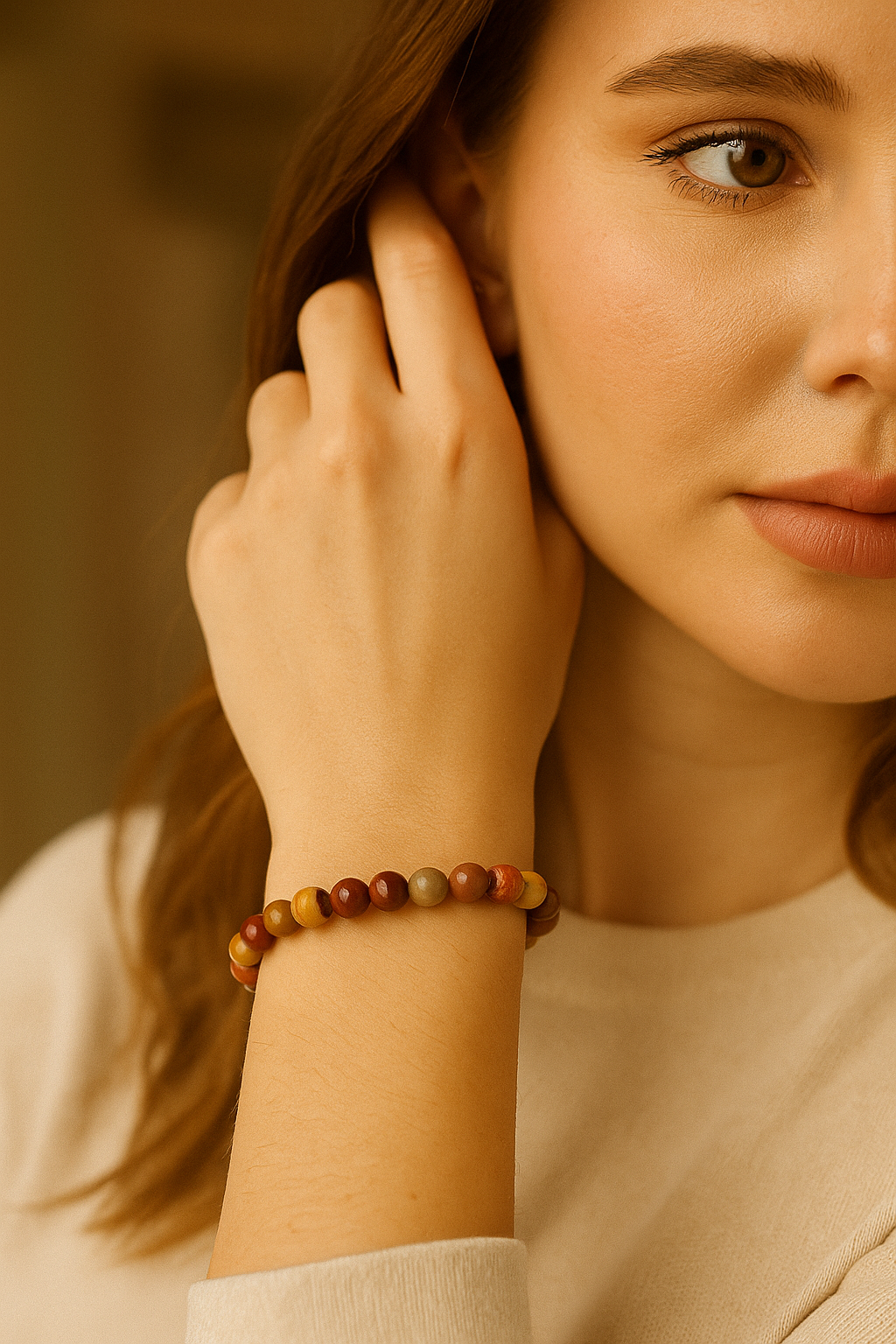 Toprak tonlarının en sıcak temsilcilerinden biri olan sarı jasper taşı, bu özel bileklikte 6 mm yuvarlak kesim formunda dizilmiş ve sade, doğal bir şıklıkla sunulmuştur. Mat sarı, hardal ve krem tonlarının doğal desenlerle birleştiği bu bileklik; dengeli, neşeli ve özgün bir görünüm sunar.