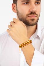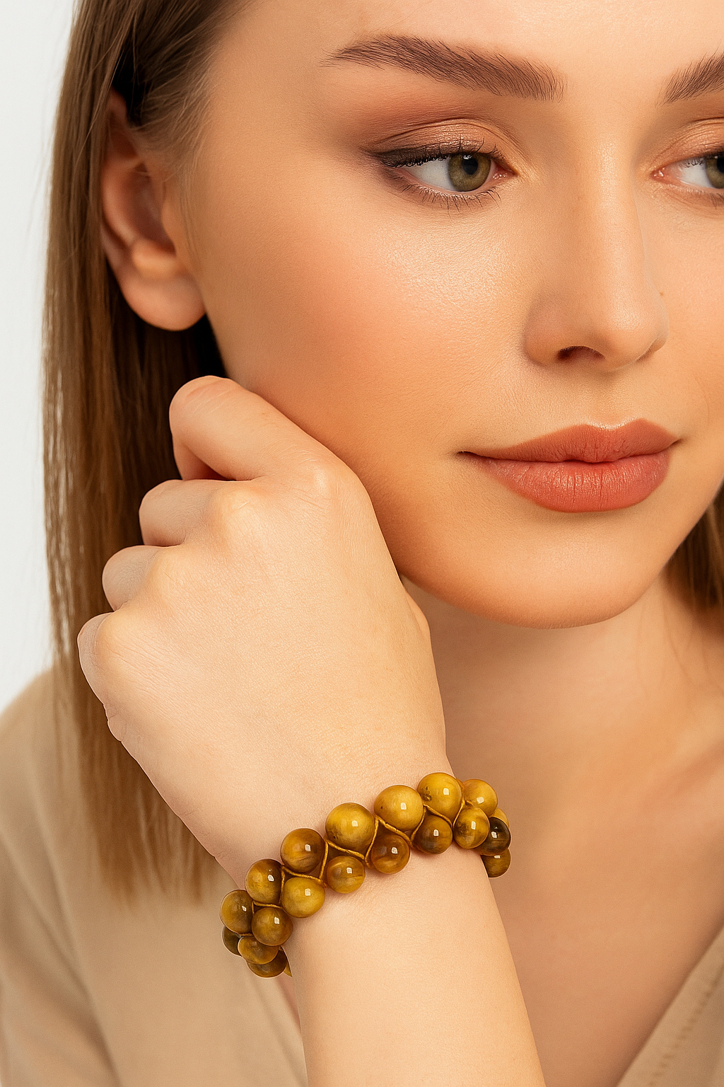 Altın sarısı, bal rengi ve kahverengi çizgisel yansımalarıyla tanınan sarı kaplan gözü taşı, bu özel bileklikte 8 mm yuvarlak kesim formunda dizilmiş ve çift sıra el yapımı makrome örgü ile tamamlanmıştır. Işığa göre hareket eden ipeksi parlaklığıyla bilekte güçlü, klasik ve enerjik bir görünüm sunar.