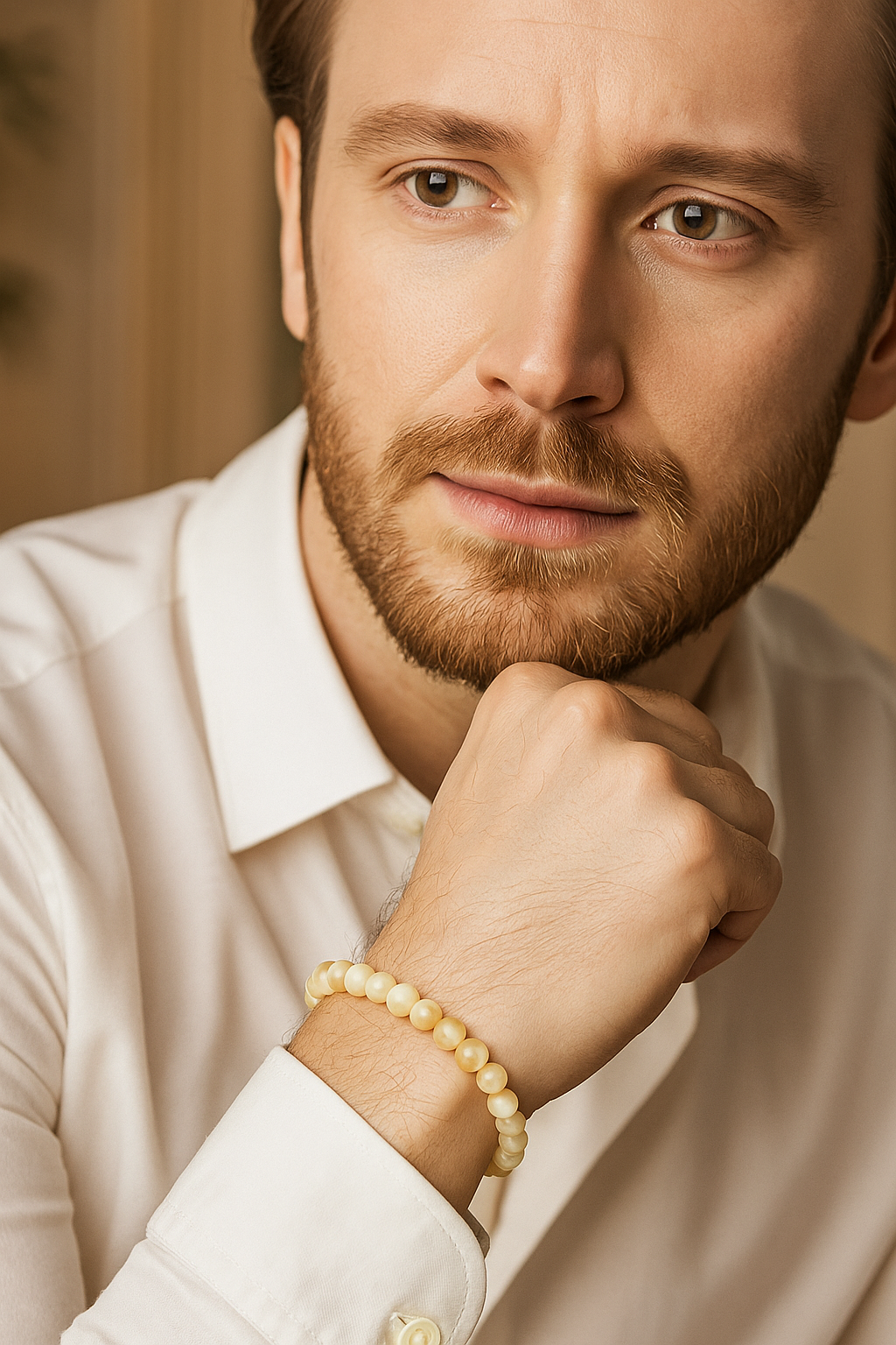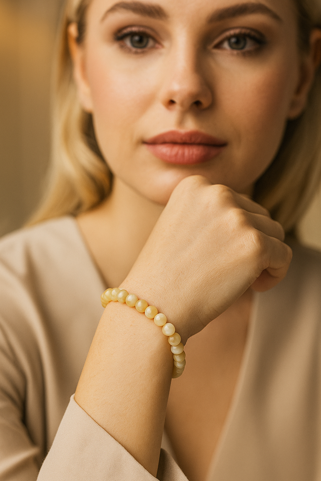 İnci beyazı ışıltısı, saten parlaklığı ve zarif dokusuyla tanınan sedef taşı, bu özel bileklikte 6 mm yuvarlak kesim formunda dizilmiş ve sade, zarif bir görünümle tamamlanmıştır. Yumuşak ışık yansımaları ile bilekte doğal bir şıklık ve huzurlu bir duruş sunar.