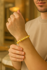 İnci beyazı, krem ve hafif opal tonlarının doğal ışıltısıyla göz kamaştıran sedef taşı, bu özel bileklikte 8 mm yuvarlak kesim formunda dizilmiş ve zarif, klasik bir tasarımla tamamlanmıştır. Taşların yüzeyinde ışığa göre değişen sedef parlaklığı, bilekte yumuşak ve asil bir duruş sergiler.