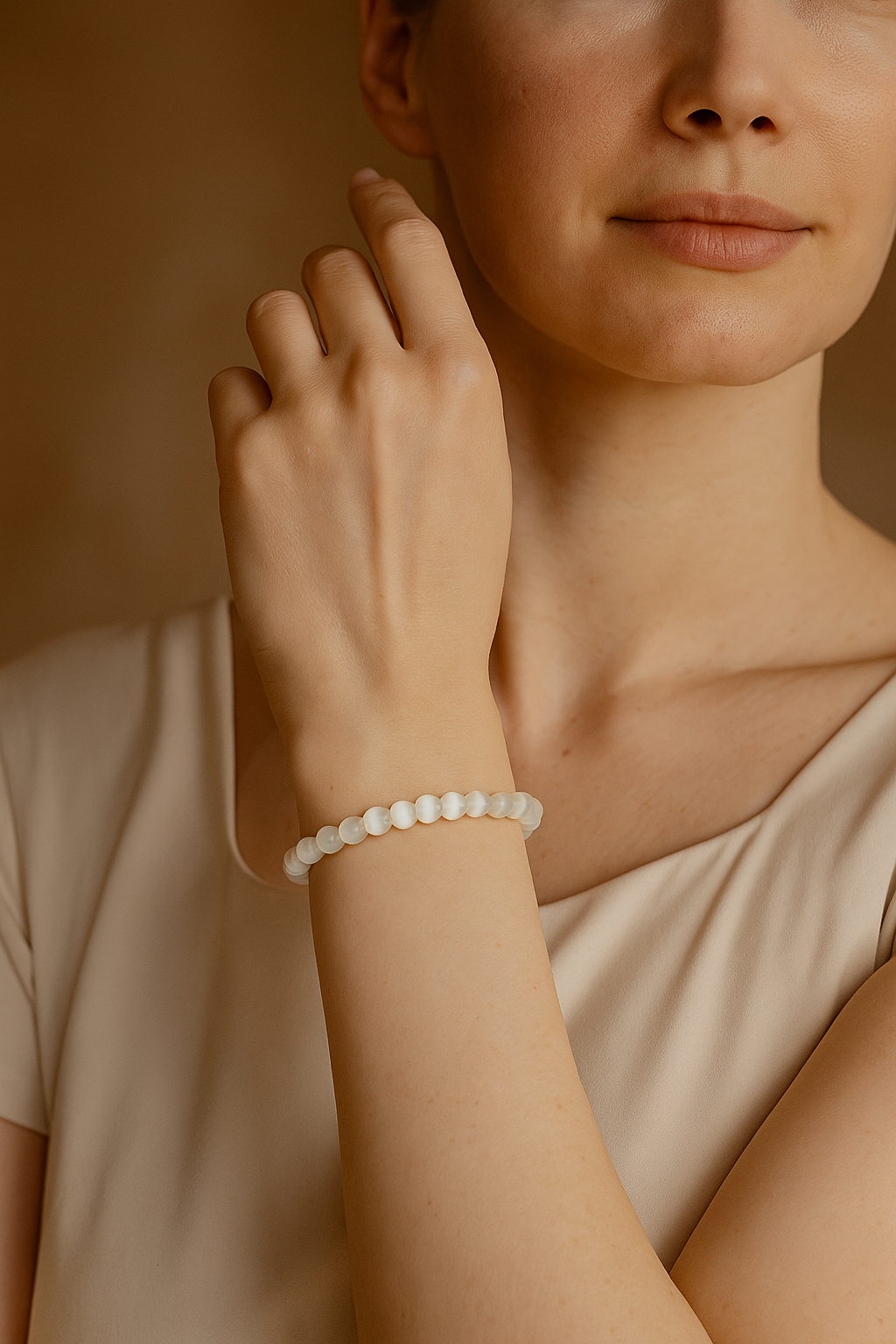 Süt beyazı rengi, ipeksi parlaklığı ve yarı saydam yapısıyla tanınan selenit taşı, bu özel bileklikte 6 mm yuvarlak kesim formunda dizilmiş ve sade, zarif bir tasarımla sunulmuştur. Doğal taşın saf görünümü, bilekte hafif ve huzur veren bir duruş sağlar.