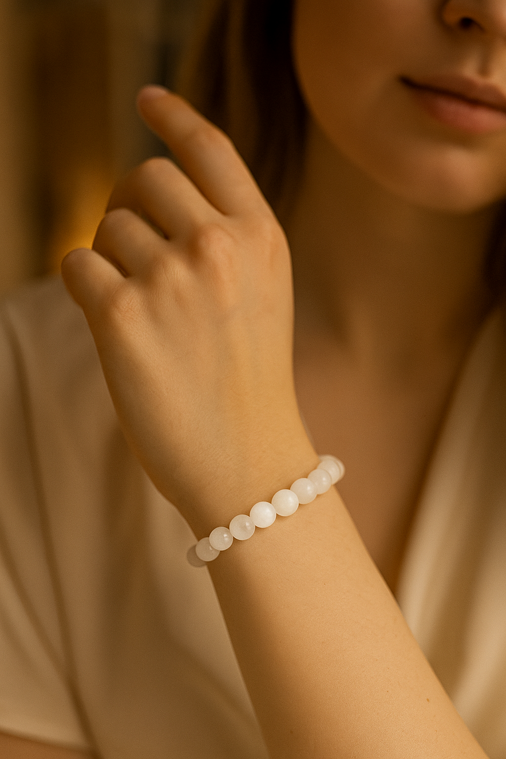 İnci beyazı tonları, yarı saydam yapısı ve ipeksi yüzey dokusuyla öne çıkan selenit taşı, bu özel bileklikte 8 mm yuvarlak kesim formunda dizilmiş ve sade, rafine bir tasarımla sunulmuştur. Taşların içsel parlaklığı ve doğal çizgileri, bilekte saf, arınmış ve zarif bir görünüm oluşturur.