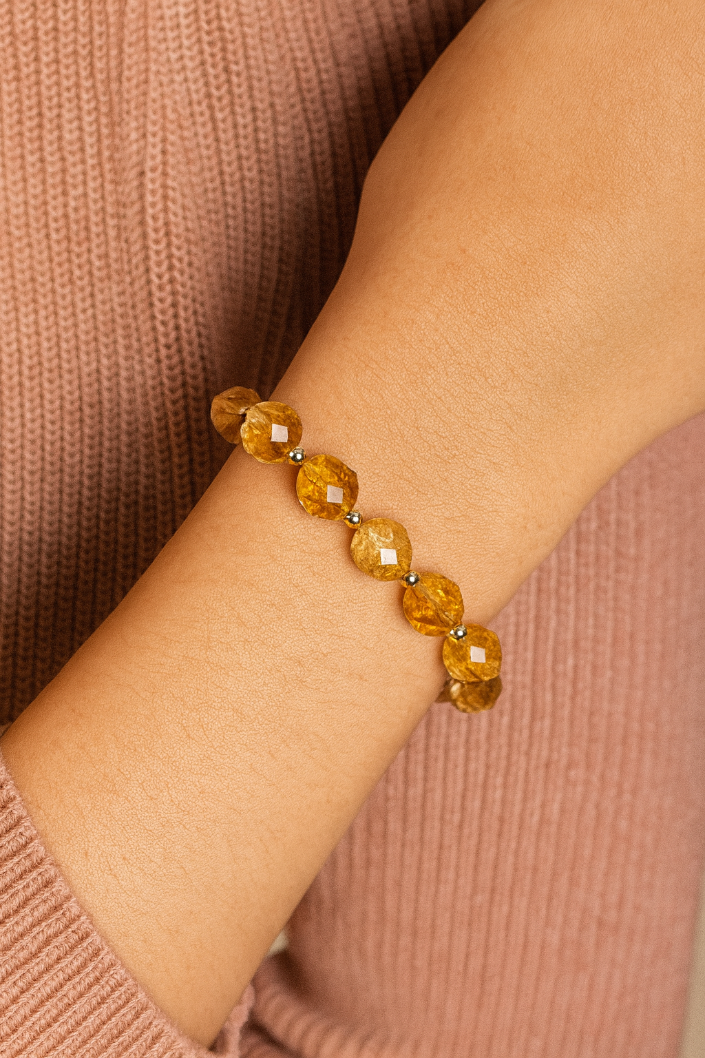 Faset kesimli sitrin taşlarının şıklığıyla tasarlanan bu makrome bileklik, modern ve zarif görünümüyle öne çıkar. El işçiliğiyle hazırlanan makrome örgü, hem dayanıklı hem de konforlu yapısıyla günlük kullanıma uygundur.