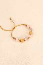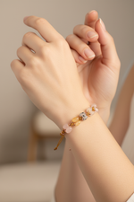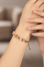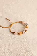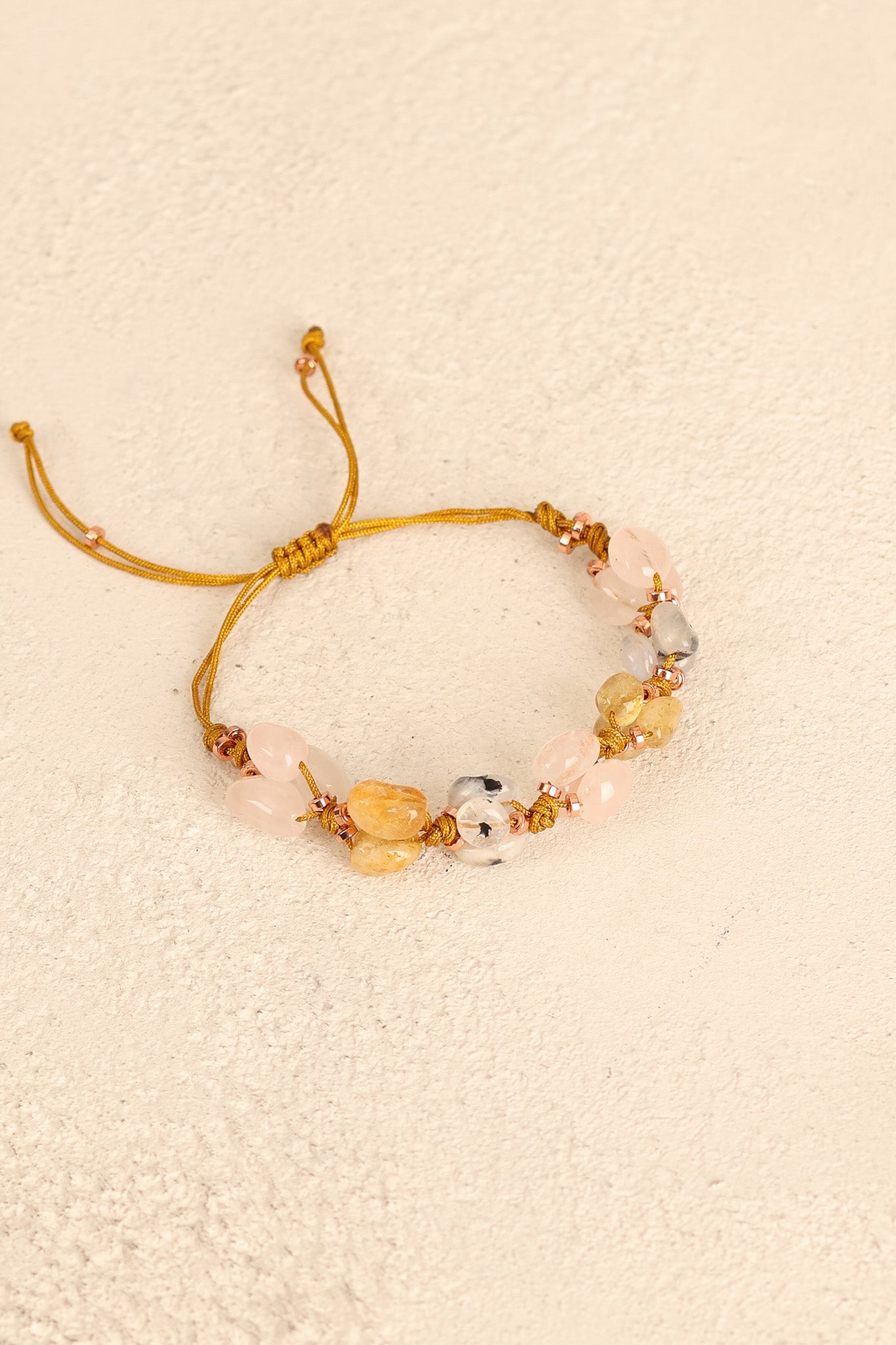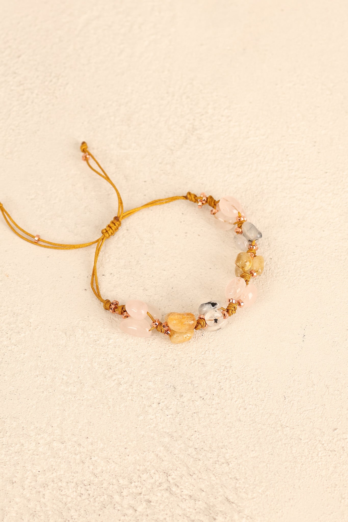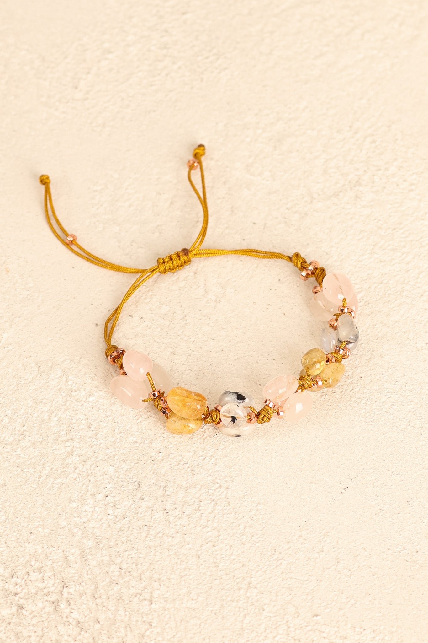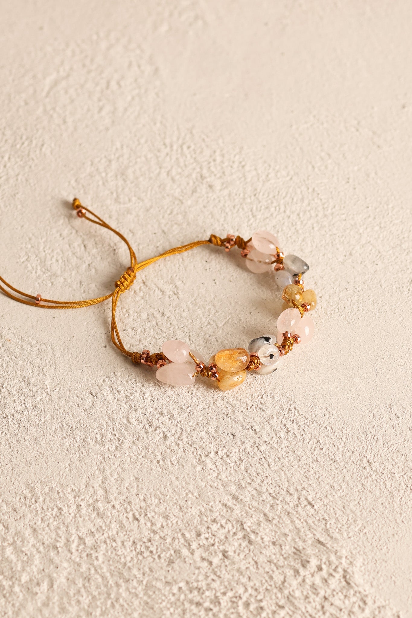 Bal rengi ışıltısıyla sitrin, yumuşak pembe tonlarıyla pembe kuvars, opal beyaz dokusuyla ay taşı ve metalik grisiyle hematit taşı; bu özel bileklikte uyumlu bir dengede bir araya geldi. Ayarlanabilir makrome örgü tekniğiyle hazırlanan bileklik, bilekte zarif, dengeli ve çok yönlü bir duruş sunar.
