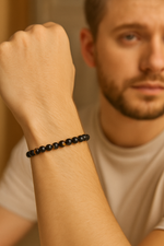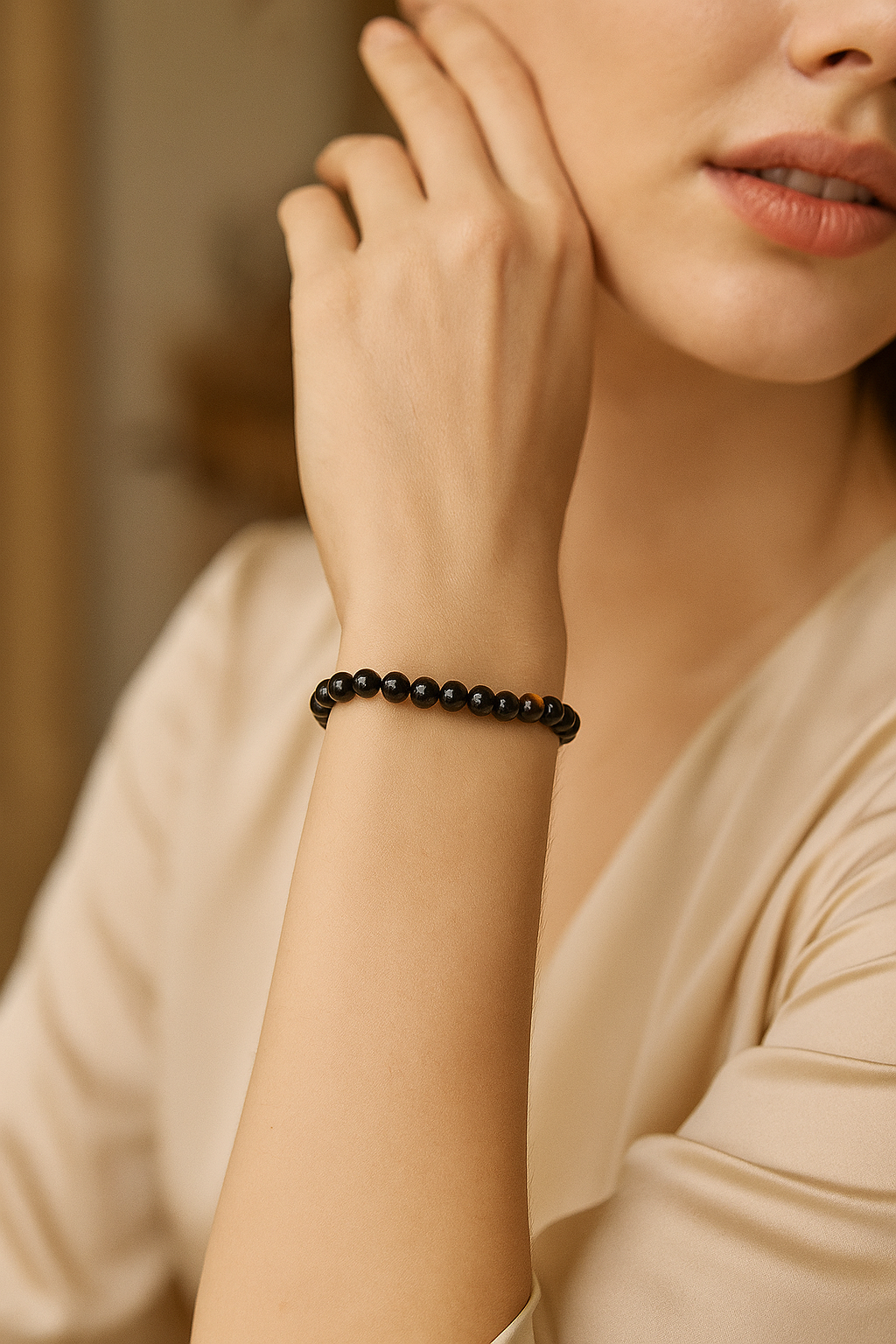 Derin siyah zemin üzerine gri ve beyaz halkalarla oluşan doğal “göz” desenleriyle tanınan siyah göz akik taşı, bu özel bileklikte 6 mm yuvarlak kesim formunda dizilmiş ve sade ama dikkat çekici bir tasarımla tamamlanmıştır. Her taşın merkezinde yer alan doğal halkalar, bilekte güçlü ve gizemli bir görünüm sunar.